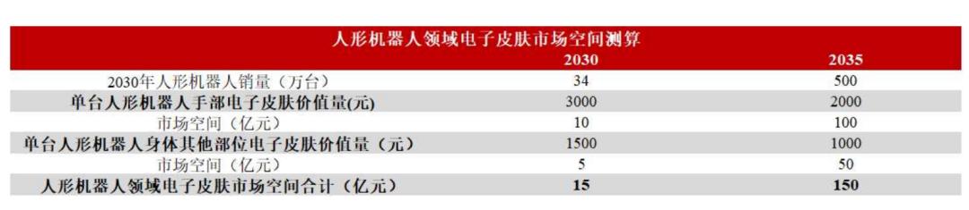 预计2035年,人形机器人领域电子皮肤市场空间有望达150亿元。根据高工机器人产业研究所对2030和2035年人形机器人销量预测,假设2030年、2035年手部电子皮肤价值量为3000元、2000元;由于身体其他部位所需的传感器数量较少,价值量为手部的50%,则为1500元、1000元,预计2035年,人形机器人领域电子皮肤市场空间有望达150亿元。