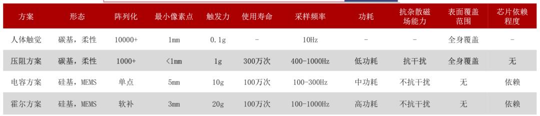 压阻式方案为当前主流传感方案。相较于其他方案,压阻式方案结构简单,具有较高的灵敏度,成本更低,有望率先实现规模化量产。但压阻式方案同样存在迟滞性较大、不利于快速响应等问题,技术仍有较大迭代或补充空间