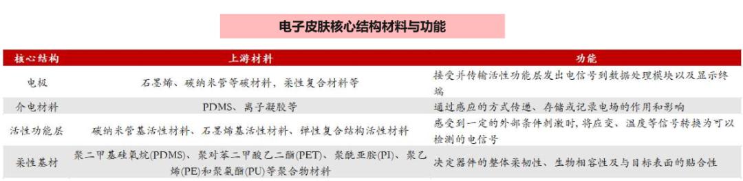 电子皮肤一般由电极、介电材料、活性功能层和柔性基材等组分构成: