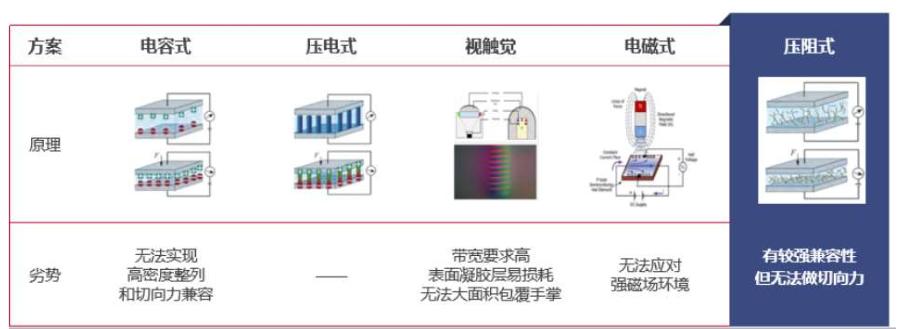 压阻式方案具有五大优势:1)适配性强;2)检测灵敏度高;3)全掌覆盖;4)通信带宽要求低;5)指尖切向力测量可通过其他结构方式弥补。