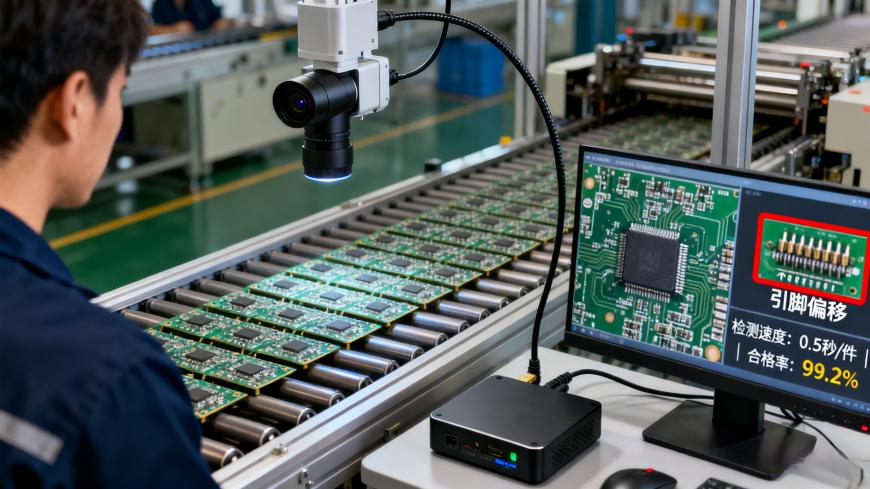 DN84 搭载 RK3576 处理器,内置 6TOPS 高性能 NPU,可将 AI 视觉检测模型直接部署于产线本地,实现从图像采集到缺陷判定的全流程数据就地处理。在 3C 电子元件贴片检测场景下,经实测全流程耗时可压缩至 0.5 秒 / 件以内,既能轻松应对此类高精度场景的实时分析需求,为产线智能化质检提供强大算力支撑,又能在保障检测精度的同时,大幅提升质检环节的智能化水平与运行稳定性。