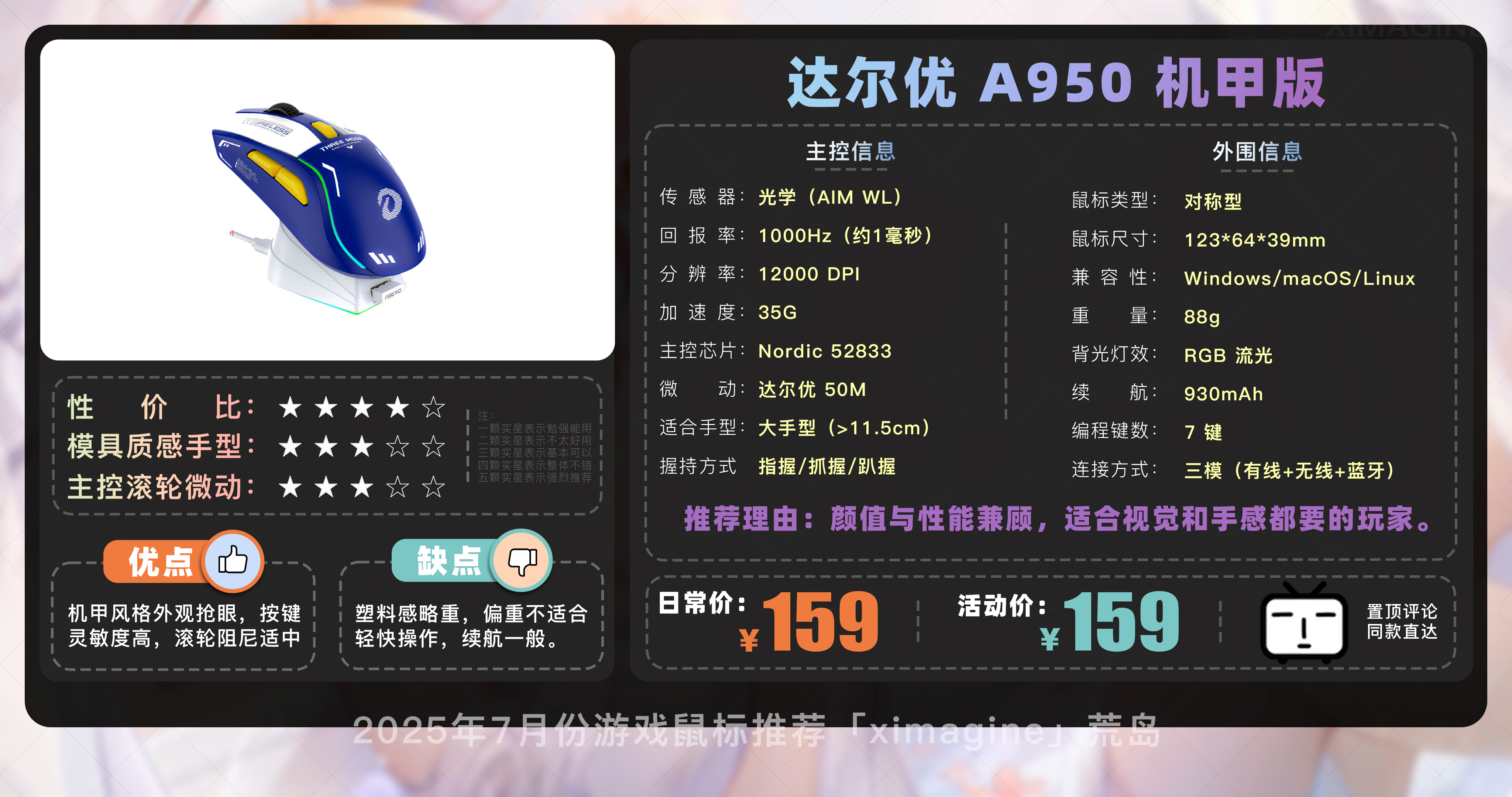 达尔优 A950 机甲版,采用Nordic 52833 主控达尔优 50M 微动,AIM WL 光学传感器,感觉很有特色,造型科技感强,握感舒适且符合人体工程学设计。按键回馈清脆,适合长时间高强度游戏。线材柔软,拖拽感小,使用起来灵活顺滑。滚轮反馈适中,适合游戏切换和办公浏览。模具做工细节精致,表面材质摸起来有质感。整体重量适中,长时间使用不会累手。当前到手价159元,适合喜欢个性设计的玩家。