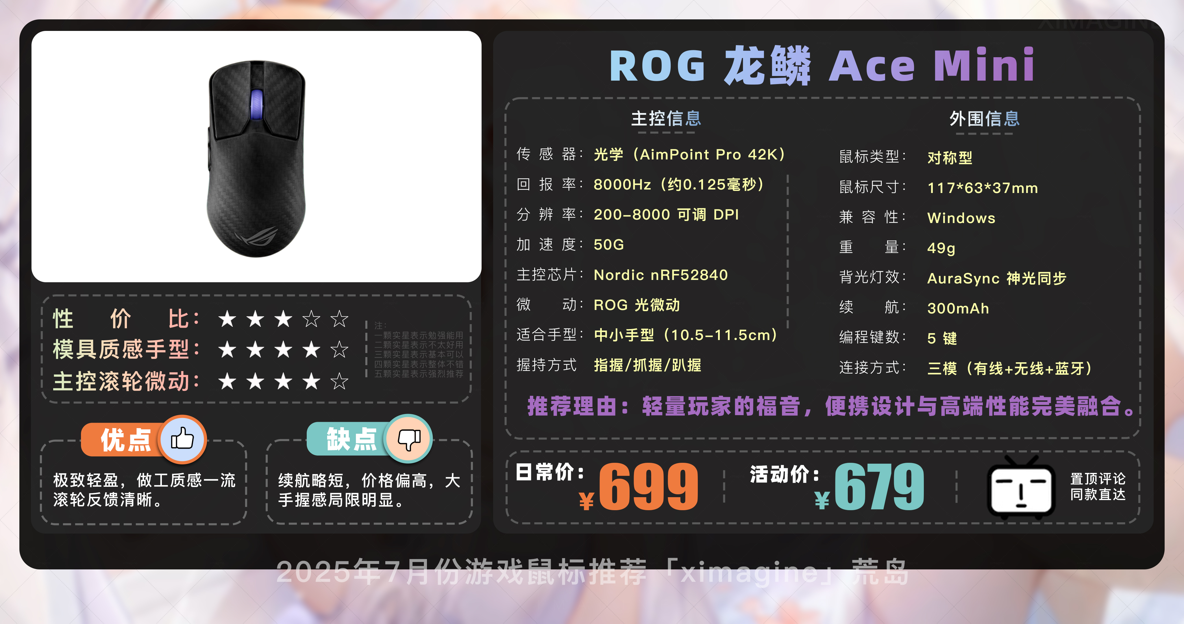ROG 龙鳞 Ace Mini,采用 Nordic nRF52840 主控 ROG 光微动,AimPoint Pro 42K 光学传感器,小巧灵活,握感紧凑,适合手小或喜欢指握的玩家。按键响应速度快,反馈精准,游戏中操作流畅。线材轻柔,移动自由不受限。滚轮转动顺滑,精准控制无压力。模具质感出色,细节设计体现电竞级标准。整体重量较轻,适合长时间高强度使用。外观时尚,电竞氛围浓厚。当前到手价679元,适合追求轻盈体验的玩家。