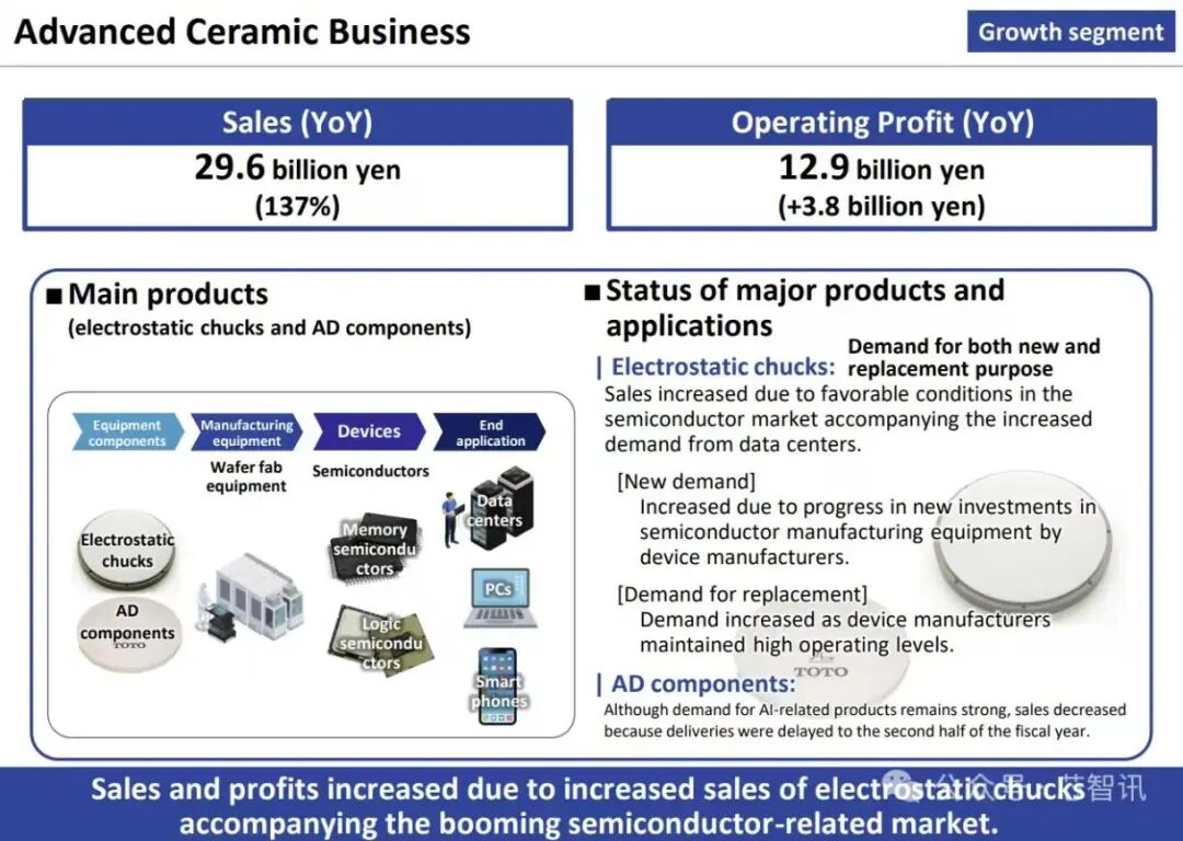 下图:TOTO的“新领域”业务主要包括:陶瓷业务和环境建材业务。其中,陶瓷业务主要是指以陶瓷组件为基础,如陶瓷半导体、光通讯设备等(图源:芯智讯)