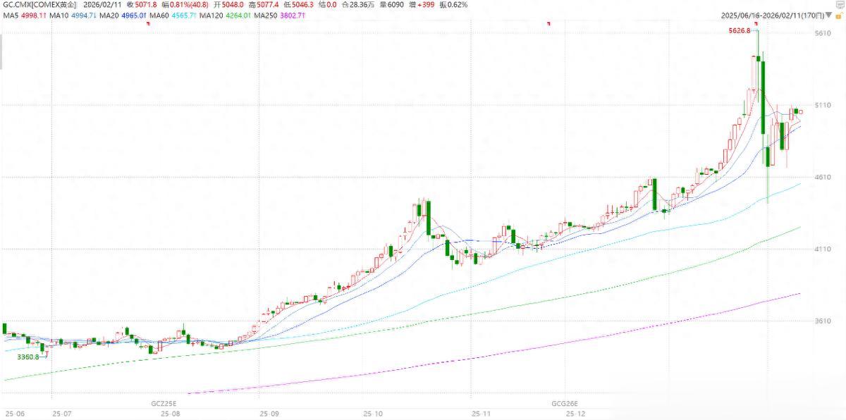 最近,黄金市场经历了一场罕见的“过山车”行情:1月29日,金价一度飙升突破5600美元/盎司的历史高点;但仅仅两个交易日后,2月2日便跌破4500美元,短短三个交易震荡幅度超过了20%;而截至2月10日,又强势反弹重回5000美元之上。