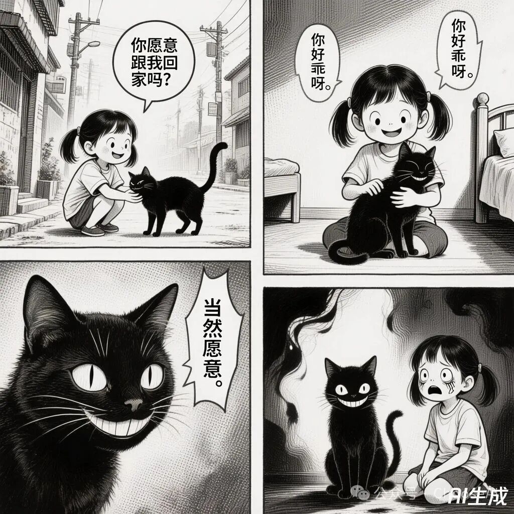生成一个关于黑猫和小女孩的四格恐怖漫画,要有对话。