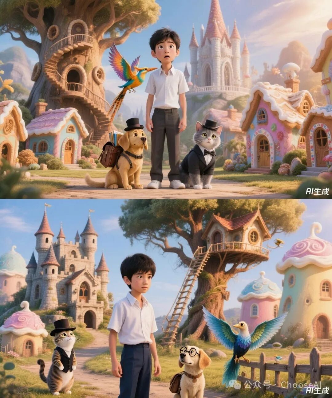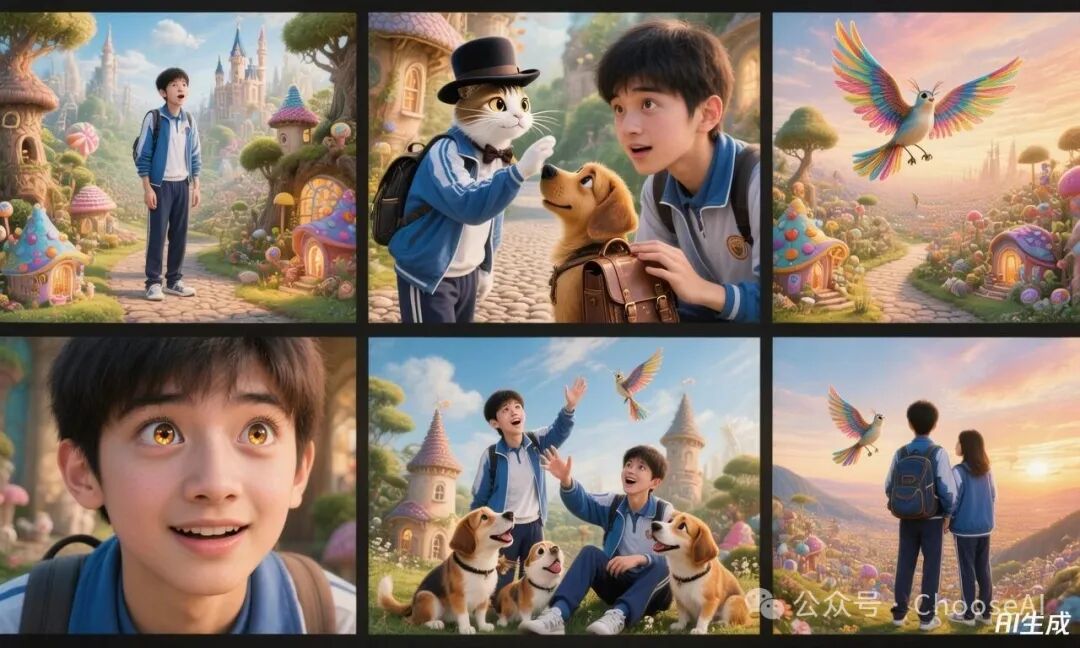 同场景异视角的图(第一组图)还好,环境和动物没有保持一致性,但小男孩还能看得出来是同一个人。