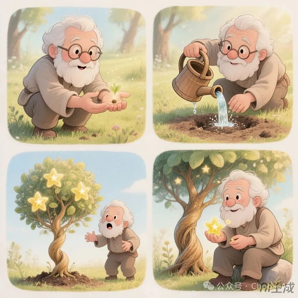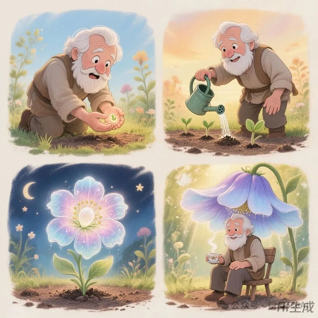 生成一个关于老爷爷的四格童话漫画。