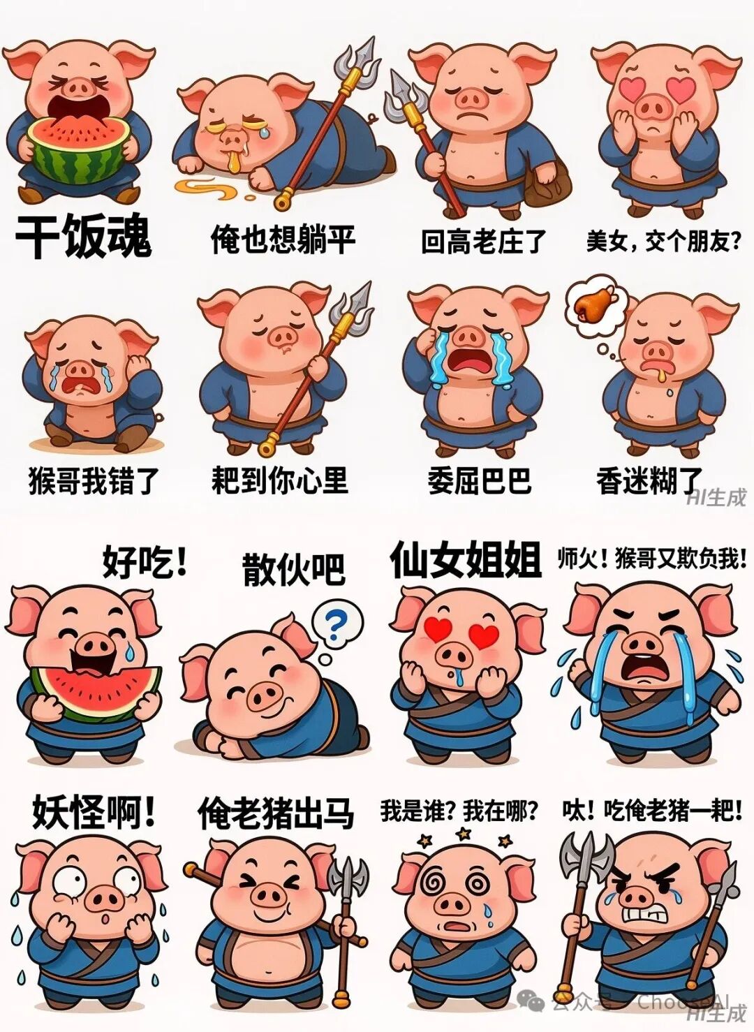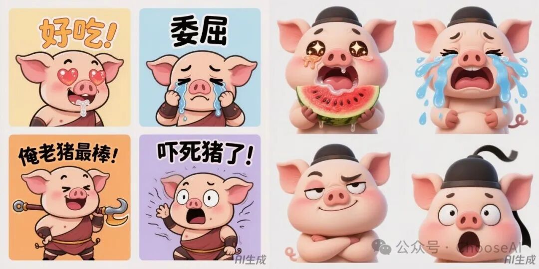 两组图的主角都可可爱爱,不过第一组图的主角形象是拟人版的猪,但并不是八戒。第二组图从主角的穿着、言行能看得出来是八戒,但是有些细节(如钉耙)容易让人出戏,中文偶有错误或不清。