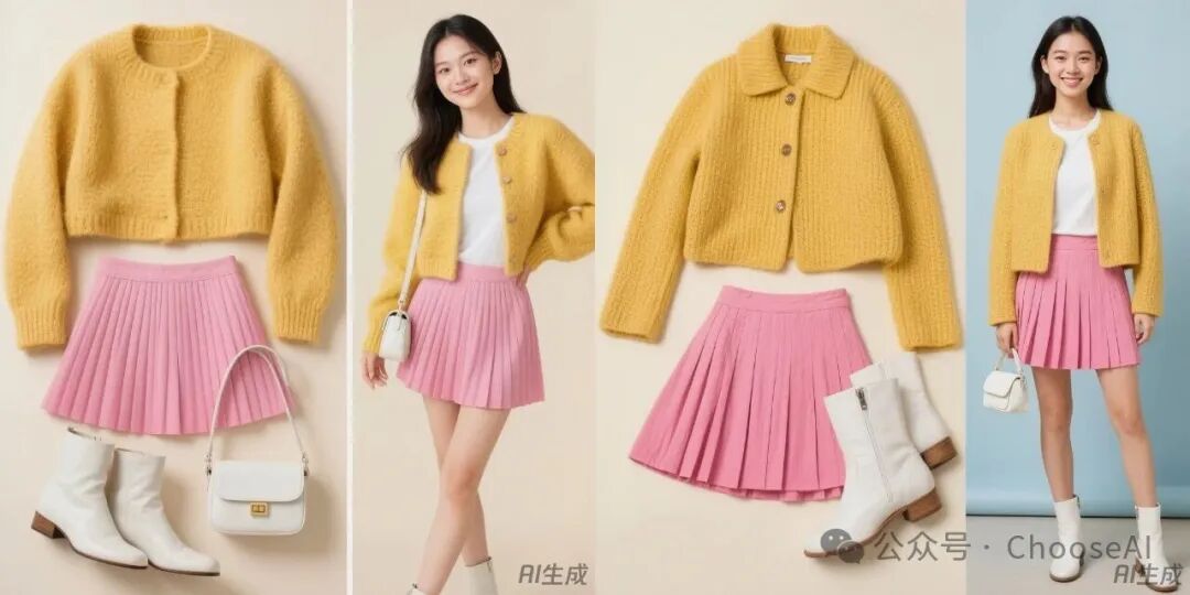 从生成的结果看,它对指令的理解到位,图像生成对齐和虚拟试衣的功能表现都比较良好,服装鞋包还原度可以说是100%。
