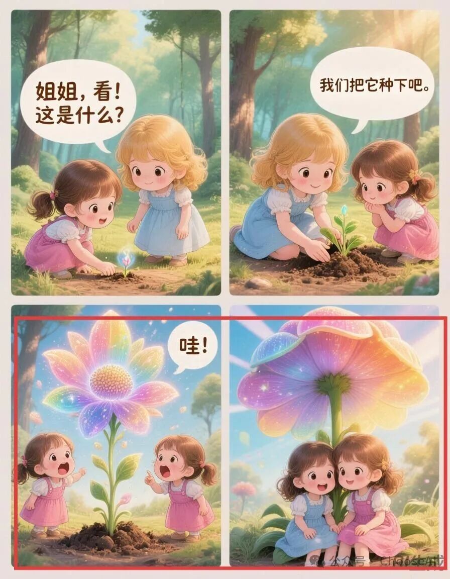 这里就要夸一夸混元生图3.0了。四格漫画的提示词非常简单,20个字以内的提示词就能产出美观、有看头的故事漫画,能自主选择黑白或者彩绘风格,比之前测的banana和即梦4.0都要省心。