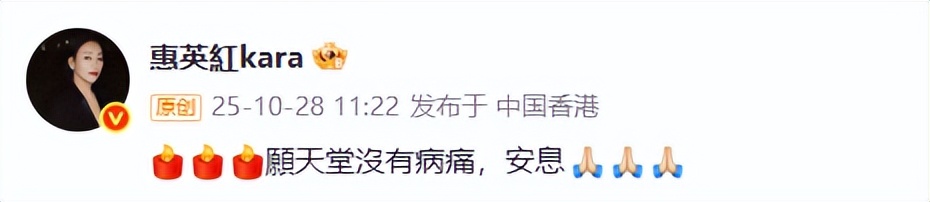 演员惠英红发文悼念:愿天堂没有病痛,安息