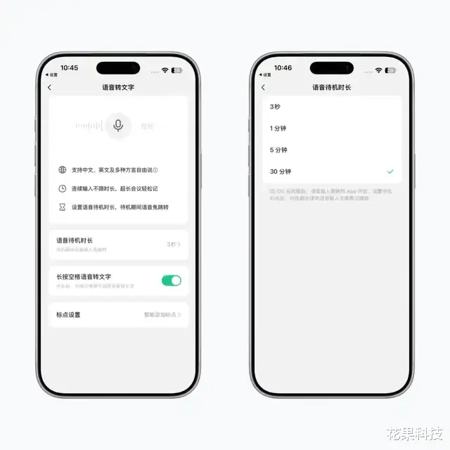 由于 iOS 系统限制,语音输入需要跳转 App 才能开启,不过现在可以在语音转文字设置页面设置待机时长。