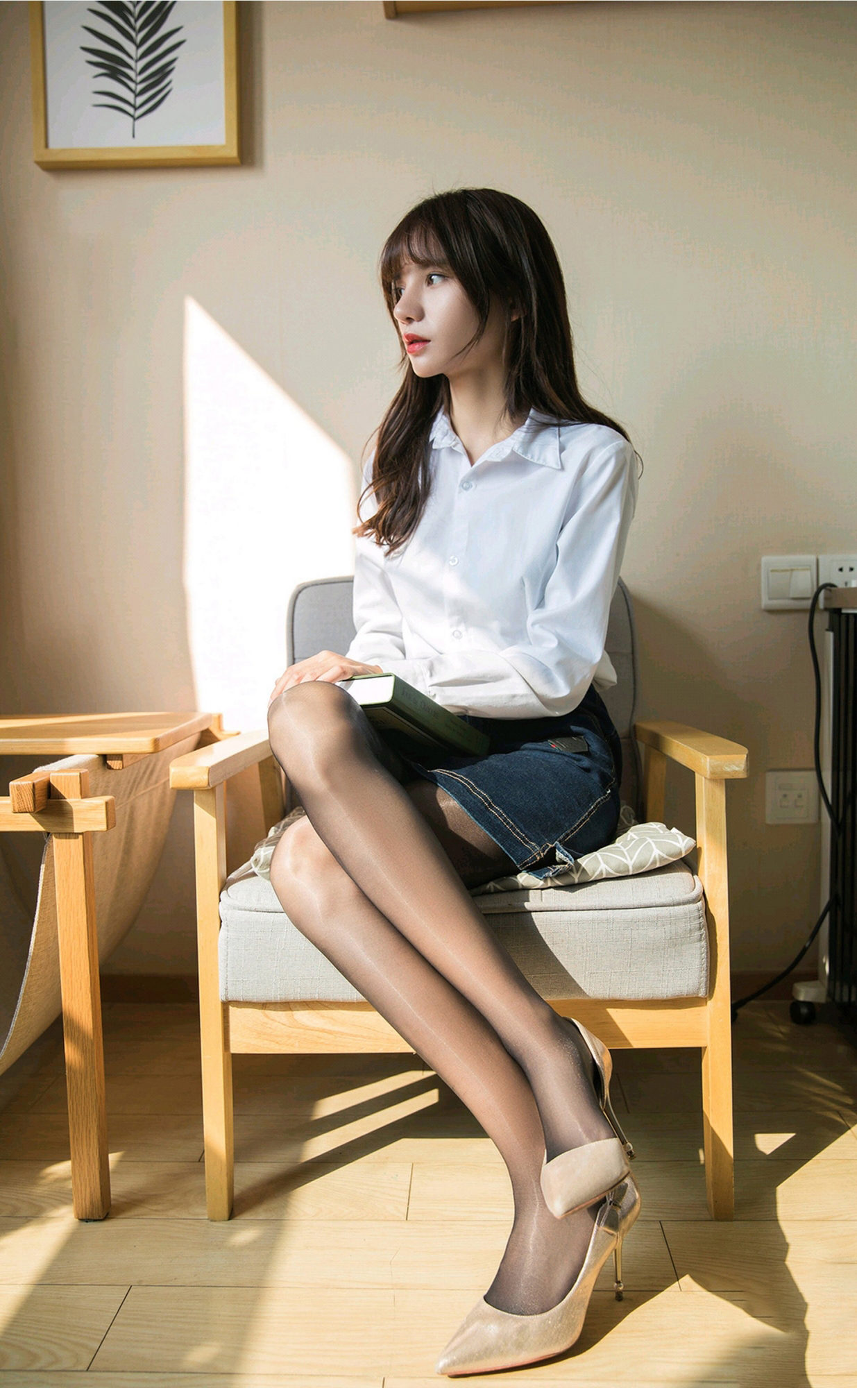 模特的上衣是一件简约的白色衬衫,给人一种干净利落的感觉。下装是一条深蓝色的牛仔短裙,与上衣形成了鲜明的对比,增添了青春的活力。鞋子是一双浅棕色的细高跟鞋,既时尚又舒适,与整体装扮相得益彰。联想到这位女性可能是一位职业女性,正在享受一段休息时间,或者是在等待某个重要的约会。