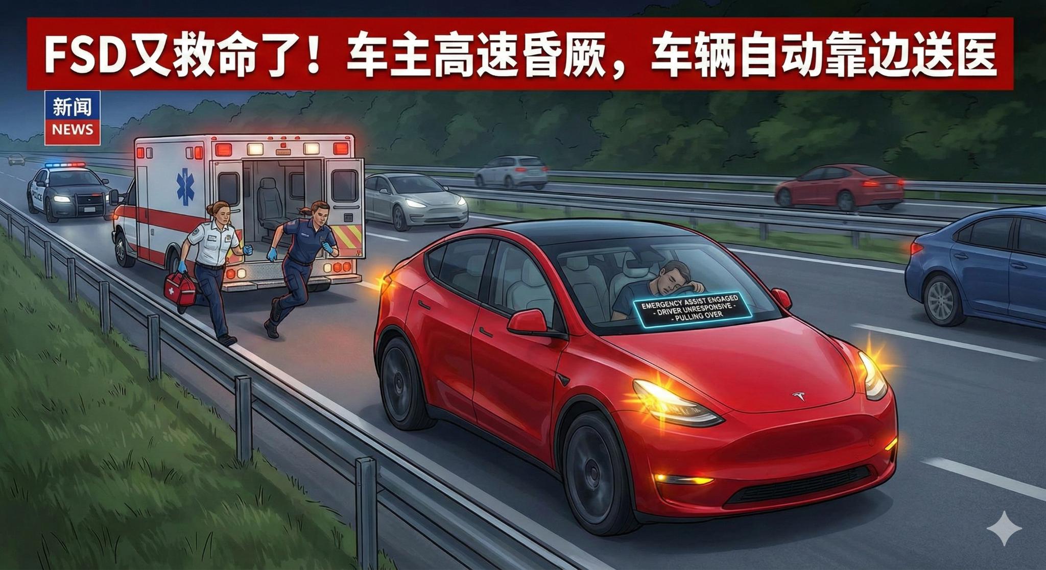 4️⃣ FSD又救命了!车主高速昏厥,车辆自动靠边送医