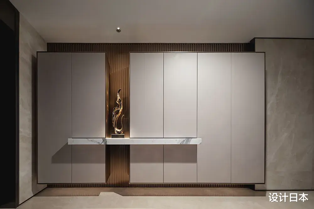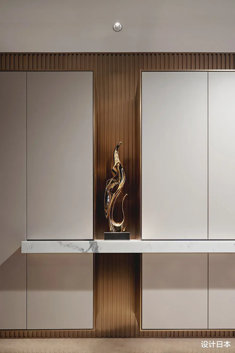 理石面板有序的拼接在柜子缝隙里,与整个柜格形成错落的壁龛,整齐摆放的金属艺术品,形成精致感,彰显主人家的喜好。