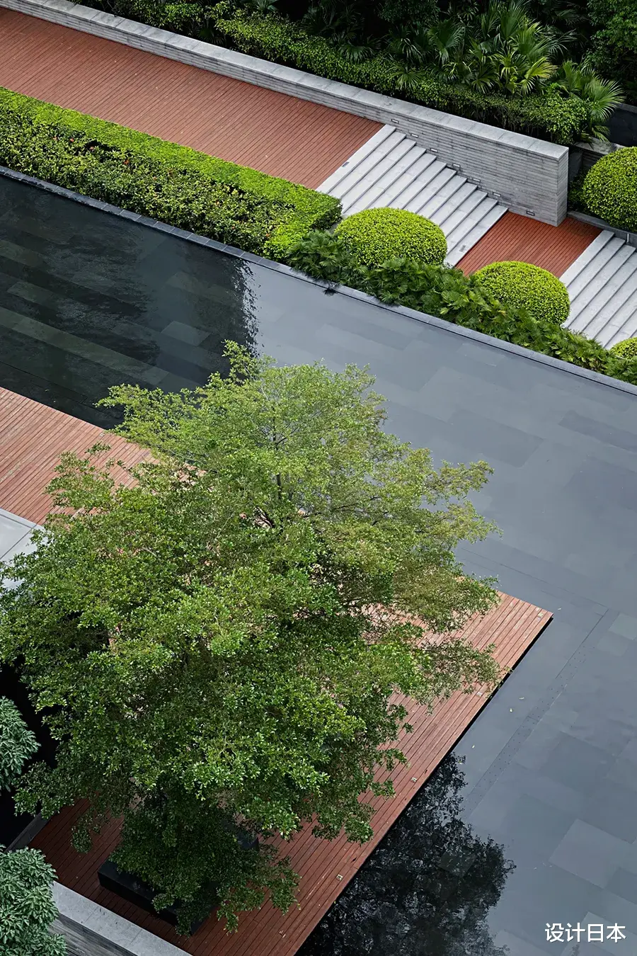 错落有致的台阶,层层叠加在一起,从中间开始向上下传递,在两旁绿植的衬托下,化身成迎宾的红色石板路,欢迎每一位到访的宾客。