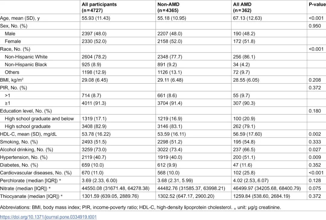 表3.高氯酸盐、硝酸盐和硫氰酸盐暴露与早发和晚发AMD风险的关联