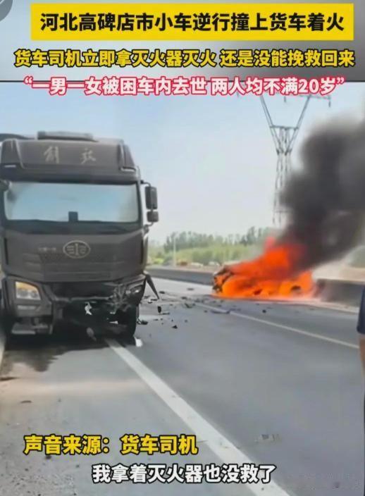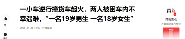 ( 信息来源:齐鲁壹点 2025年04月21日 —— 一小车逆行撞货车起火,两人被困车内不幸遇难,“一名19岁男生 一名18岁女生” )