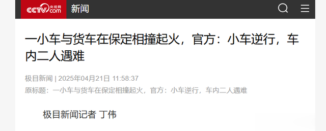 ( 信息来源:极目新闻 2025年04月21日 —— 一小车与货车在保定相撞起火,官方:小车逆行,车内二人遇难 )