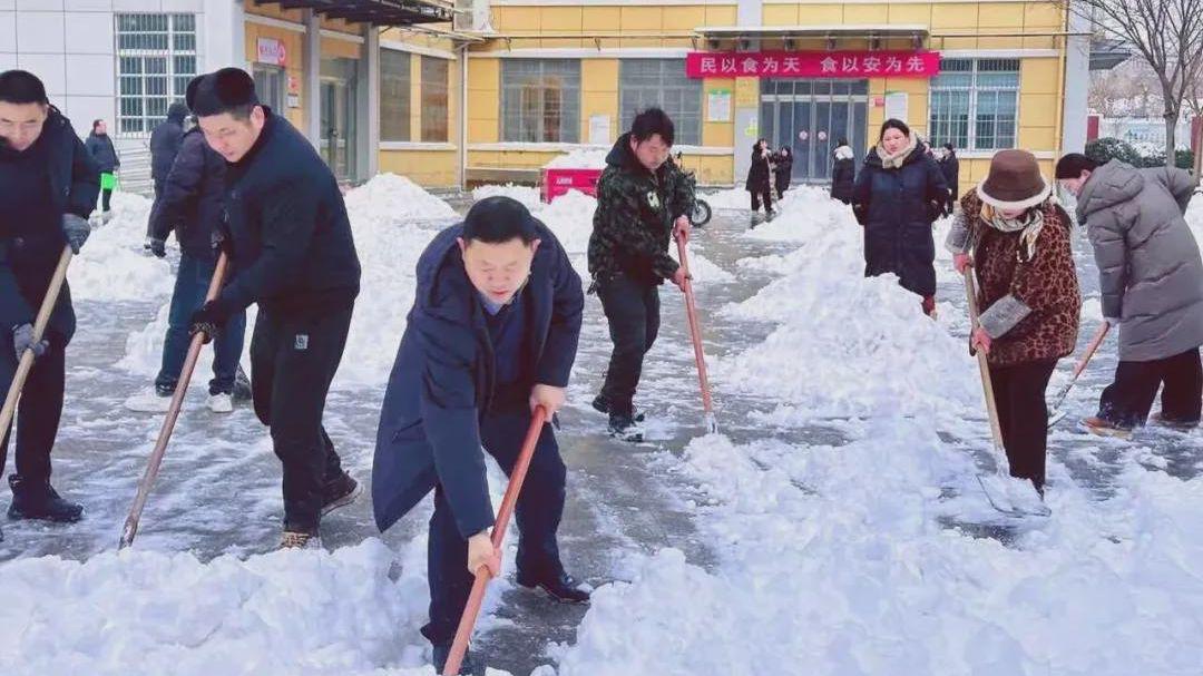 我们的老师第一时间也抵达清雪作业现场。大家手持铁锹、扫帚等工具,一同协作清理教学楼、综合楼、操场、校门口及周边道路等区域的积雪。老师们不顾严寒,弯腰挥帚扫雪,默契配合中开辟出一条条安全通道。