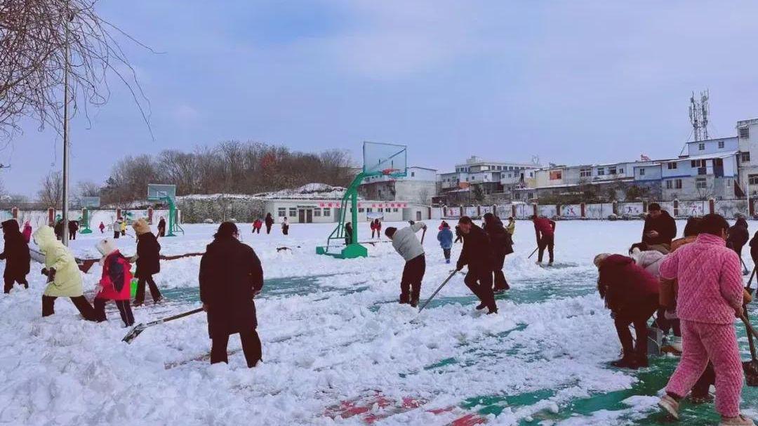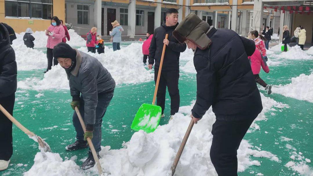 操场及四周,五年级老师和家长热火朝天地清理着厚厚的积雪,手也磨破了,腰也累疼了,可为了孩子们,大家都甘之如饴。