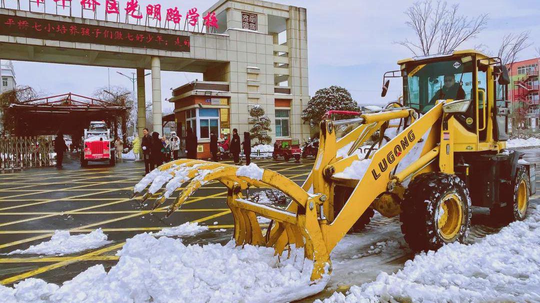校园里积雪已深,两辆铲车轰鸣着驶入操场。二3班徐智博爸爸熟练地操作着操纵杆,铲斗精准地铲起厚厚的积雪;六9班张晨曦爸爸则负责将雪堆推到角落。他们的身影在漫天飞雪中显得格外高大。