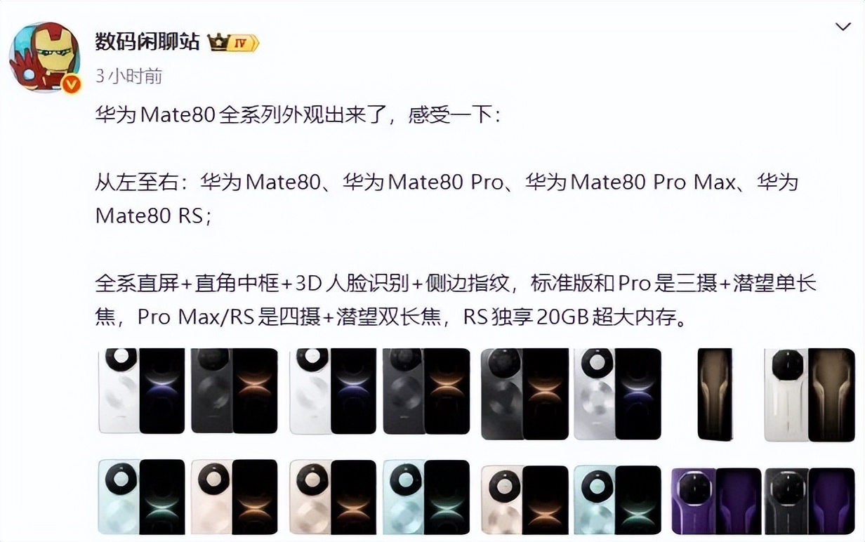 其他配置方面,博主@数码闲聊站 带来了最新消息,全系直屏+直角中框+3D人脸识别+侧边指纹,标准版和Pro是三摄+潜望单长焦,Pro Max/RS是四摄+潜望双长焦,RS独享20GB超大内存。