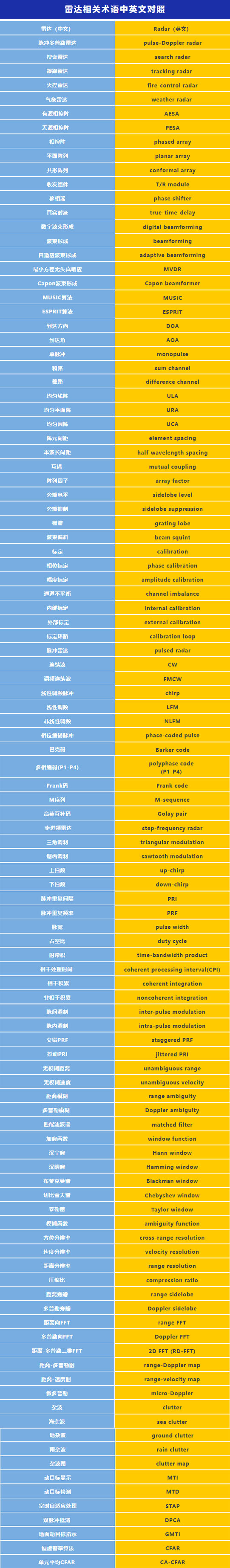 雷达、通信、电子战是行业技术体系的核心支柱,为方便伙伴们查询与学习,我们整理了对应专业术语。