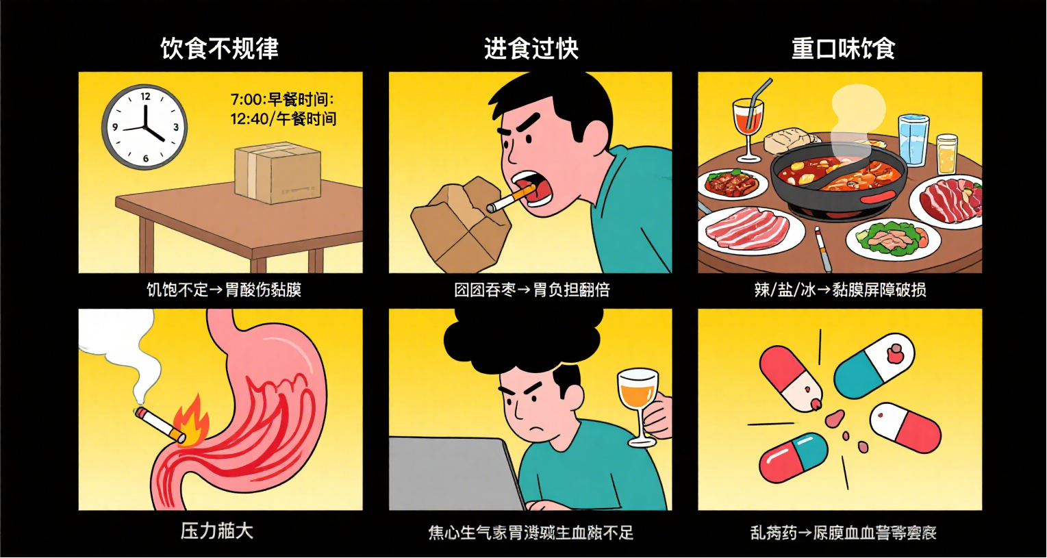 三餐不定时、暴饮暴食或过度节食,会让胃酸分泌失去节律。当胃里没有食物时,胃酸就会直接“攻击”胃黏膜,长期如此会导致黏膜糜烂。研究发现,经常不吃早餐的人,胃溃疡发病率是规律进食者的3.2倍。