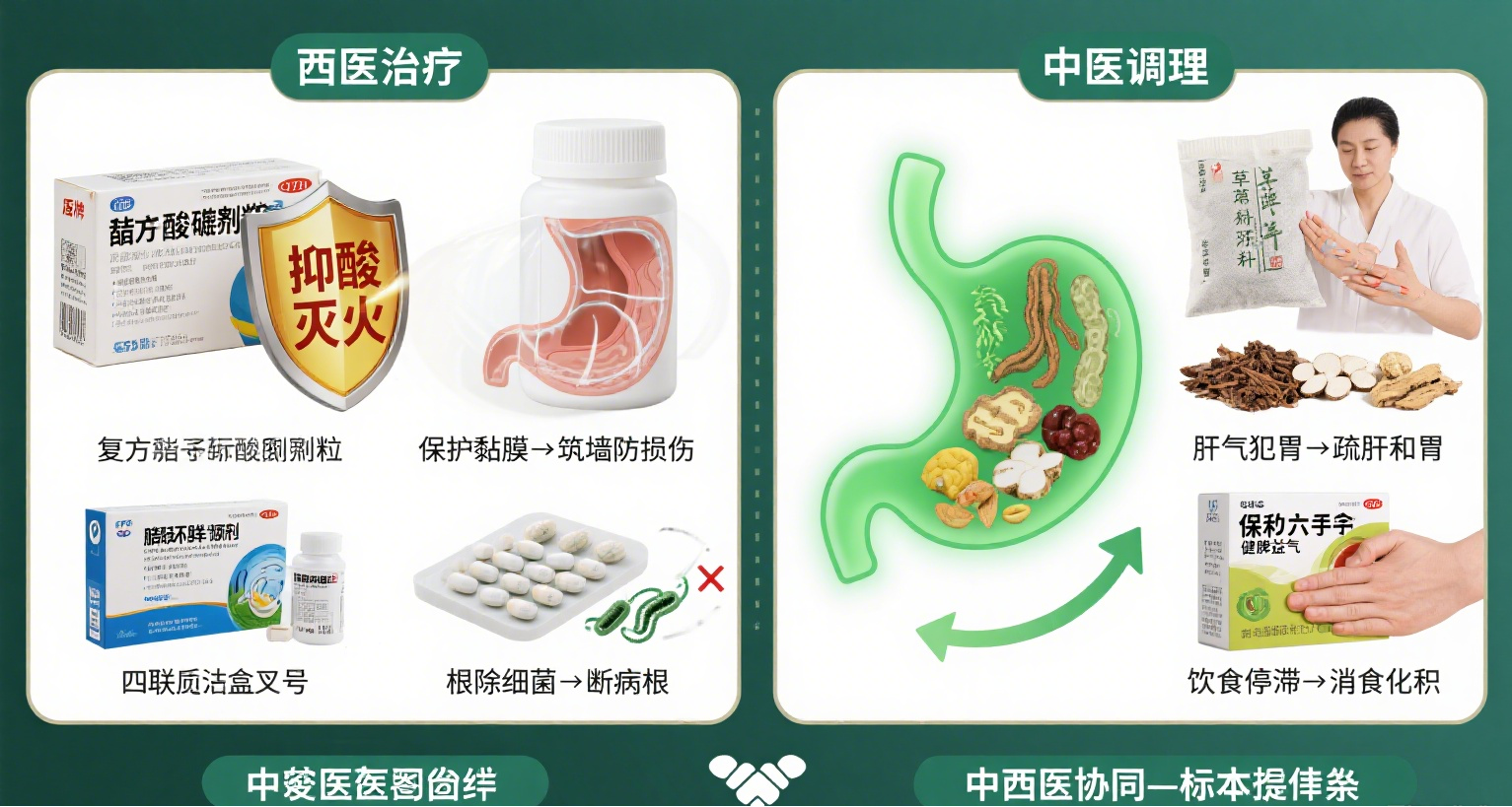 在调理过程中,有时会采用“中西协同”方案,例如用复方铝酸铋颗粒快速保护黏膜,同时结合中药调理脾胃功能,既治标又治本。