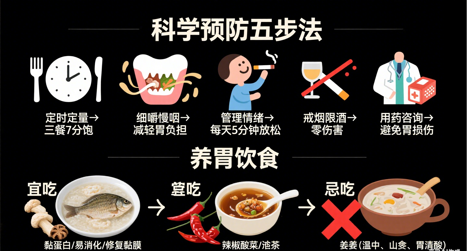 四、 科学预防+饮食调理:把胃养得“结实”起来胃部健康的核心是“减少损伤+促进修复”,这几件事比吃药更重要: