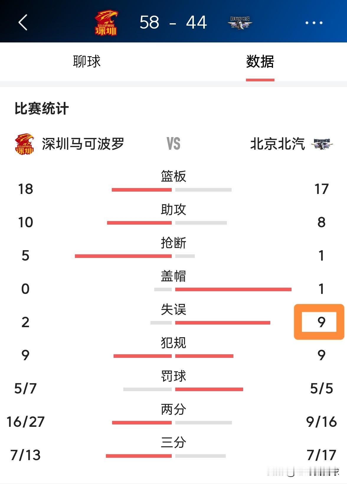 北京北汽真是太丢人现眼了!在今天北京北汽客场挑战深圳马可波罗的比赛中,目前双方半场战罢,球星云集的北京北汽竟然以44:58落后对手14分。在上半场比赛中,北京北汽出现了多达9次的失误,其中超级后卫陈盈骏出现了3次失误,而超级中锋周琦出现了2次失误,深圳马可波罗利用北京北汽出现的失误不断发动快攻反击一举扩大了领先优势。 毫不夸张的说,北京北汽在上半场比赛中被对手打得毫无还手之力,这支球星云集的豪华之师尽显狼狈。