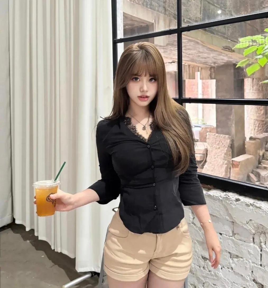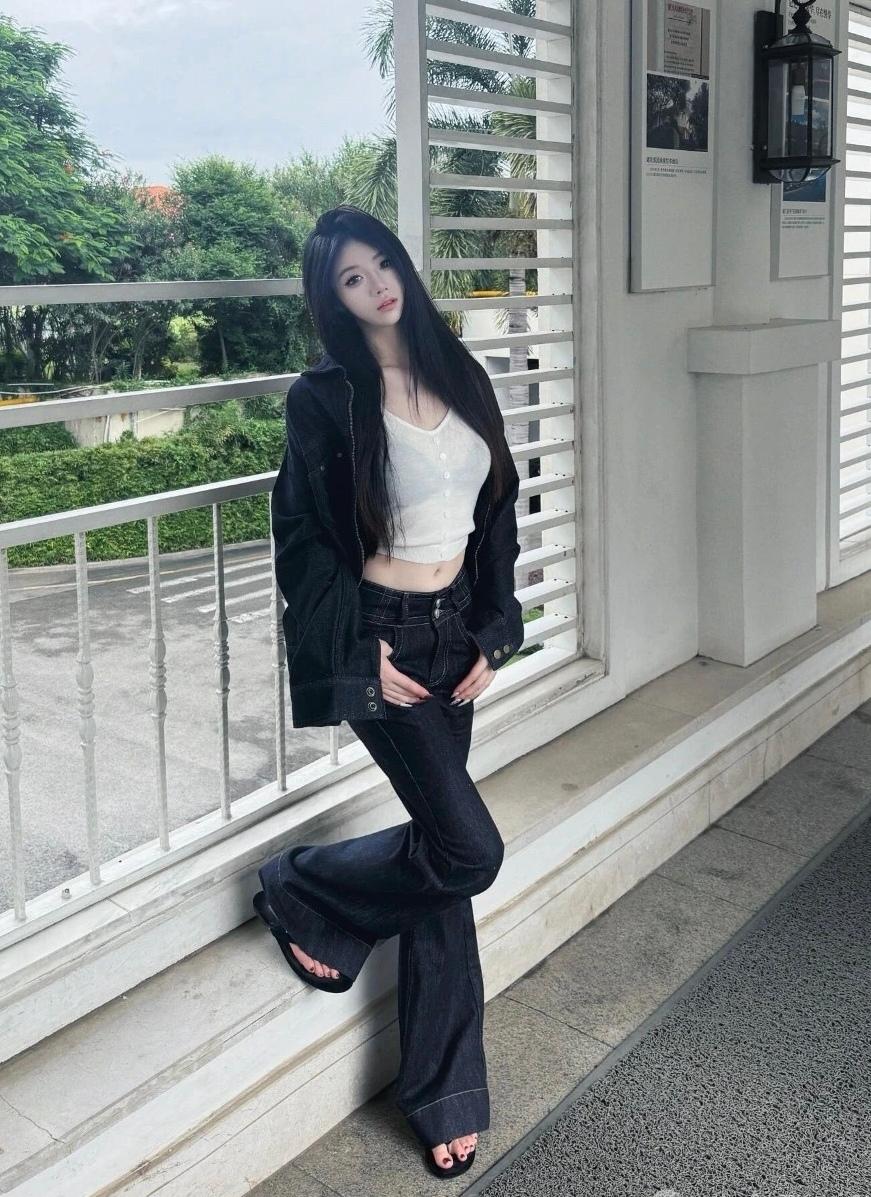 谁懂啊!白透肤上衣+浅蓝紧身牛子裤,往中式灰墙前一靠,这曲线直接戳中审美!