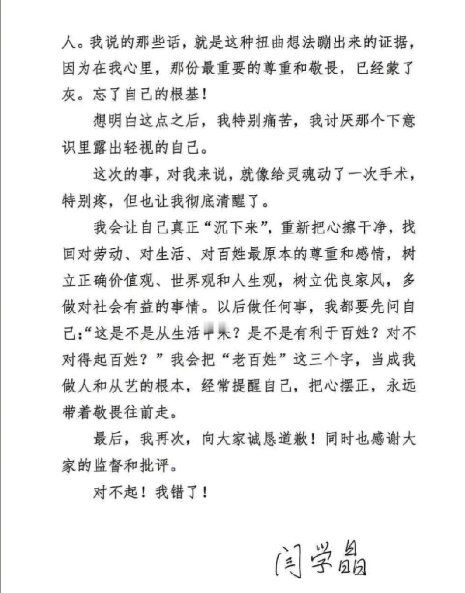 闫学晶发文说我错了,文章写得相当有水平,深刻剖析了自己。 她也没想到在网上随便讲话会惹这么多麻烦吧! 代言泡汤了,儿子的学历也被质疑。 中戏为了一个毕业约10年的学生发声,只是为了证明他当年上的是普通班。 闫学晶洋洋洒洒的文章里并没有解释为啥撒谎说林傲霏上的是新疆班,只是反复在讲自己的反思与觉醒。 作为公众人物,说错话的后果有多严重,想来她是有深刻体会了。