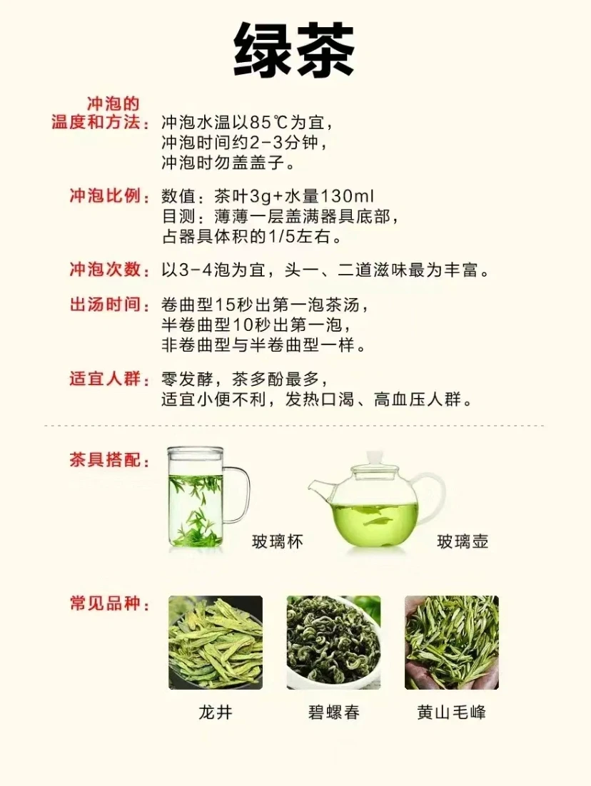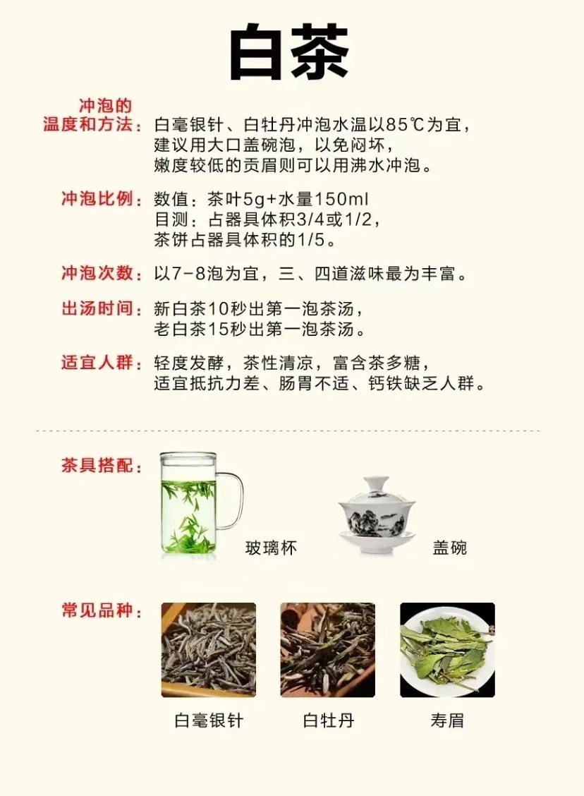 很多人说,茶类那么多,怎么才能抓到泡好茶的规律呢?学茶的确是有规律的,是茶君给大家把泡茶的规律都归纳起来了,快来看看吧! -绿茶,注意保持鲜爽,水温不可太高。 -白茶,注意区分老嫩,老白茶煮着更好喝。 -乌龙茶,讲究功夫茶泡法,壶小水烫。 -红茶,注意不要闷出酸涩,出汤要沥干。 -普洱茶,生茶熟茶新茶老茶各不同。 -黑茶,醒茶到位,就是成功了一半。 以上是常见的茶类冲泡的方法论,再结合器具、茶水比、泡茶水温、浸泡时间、注水手法等具体的操作方法,就能有技巧有规律地掌握泡茶的万能法则啦!