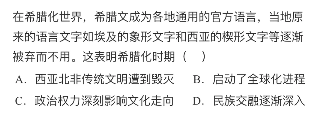 上一期答案: 知识点: 新文化运动的开展 答案: B 详解: 本题是单类型单项选择题。据本题主题干的设问词,可知这是本质题。据本题时间信息可知准确时空是:20世纪初(中国)。据材料信息可知,材料主旨是认为国民要有公德,国家才能振兴,强调民众的精神觉悟,B项正确; 材料未涉及民主科学思想,排除A项; 虽然材料说运用白话文大声疾呼国民要有公德,但未涉 及推广白话文章的态度,排除C项; 材料可以体现家国一体观念,强调家与国都需要德,但未阐述家国一体观念在中国普遍性存在,排除D项。故选B项。