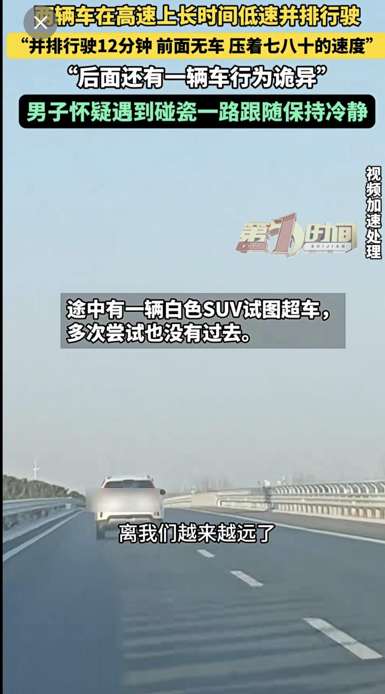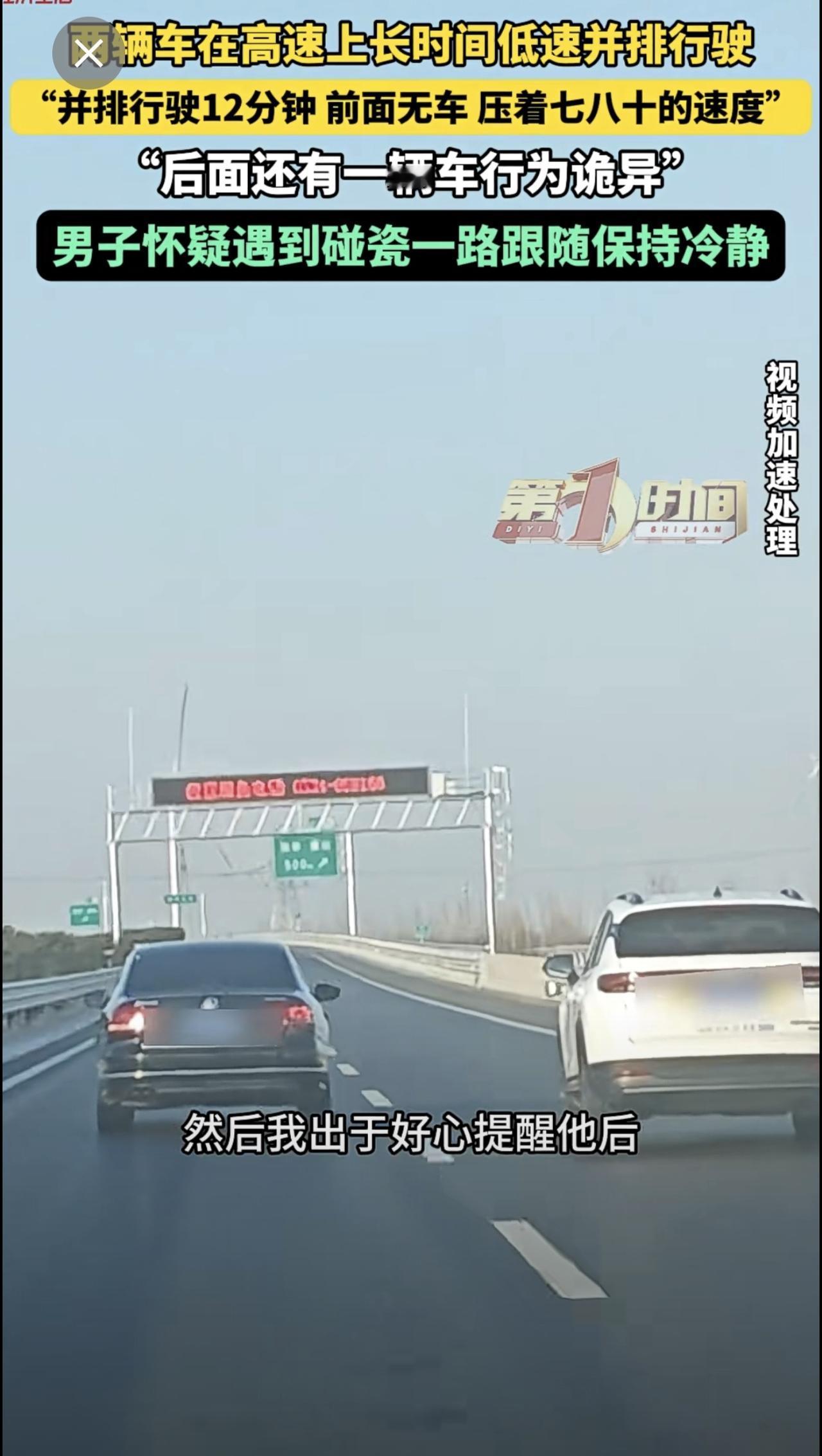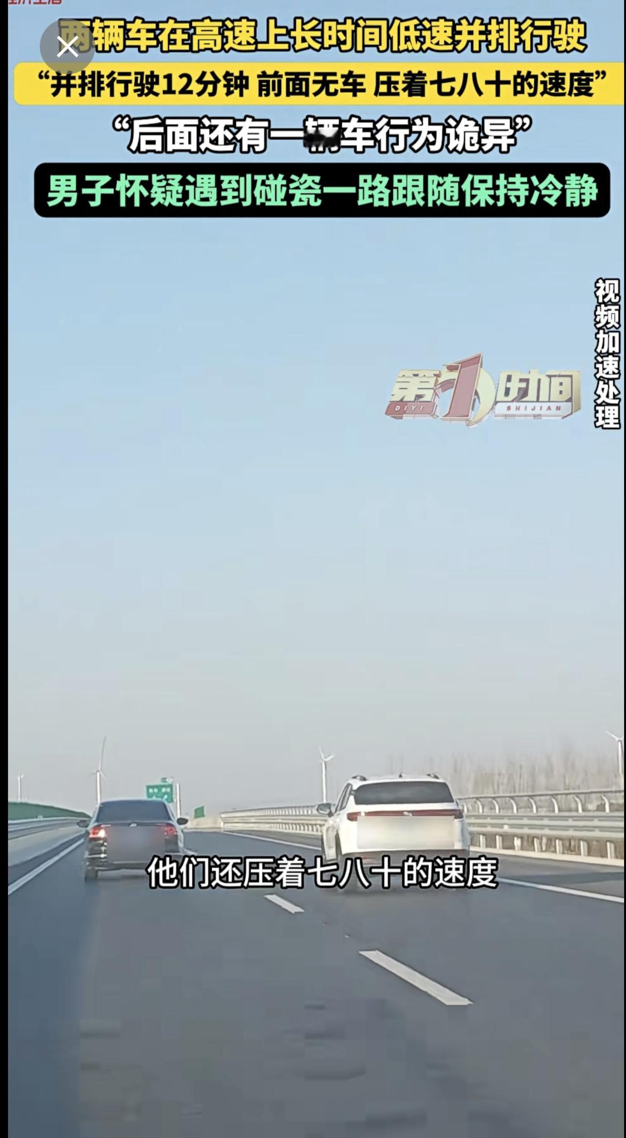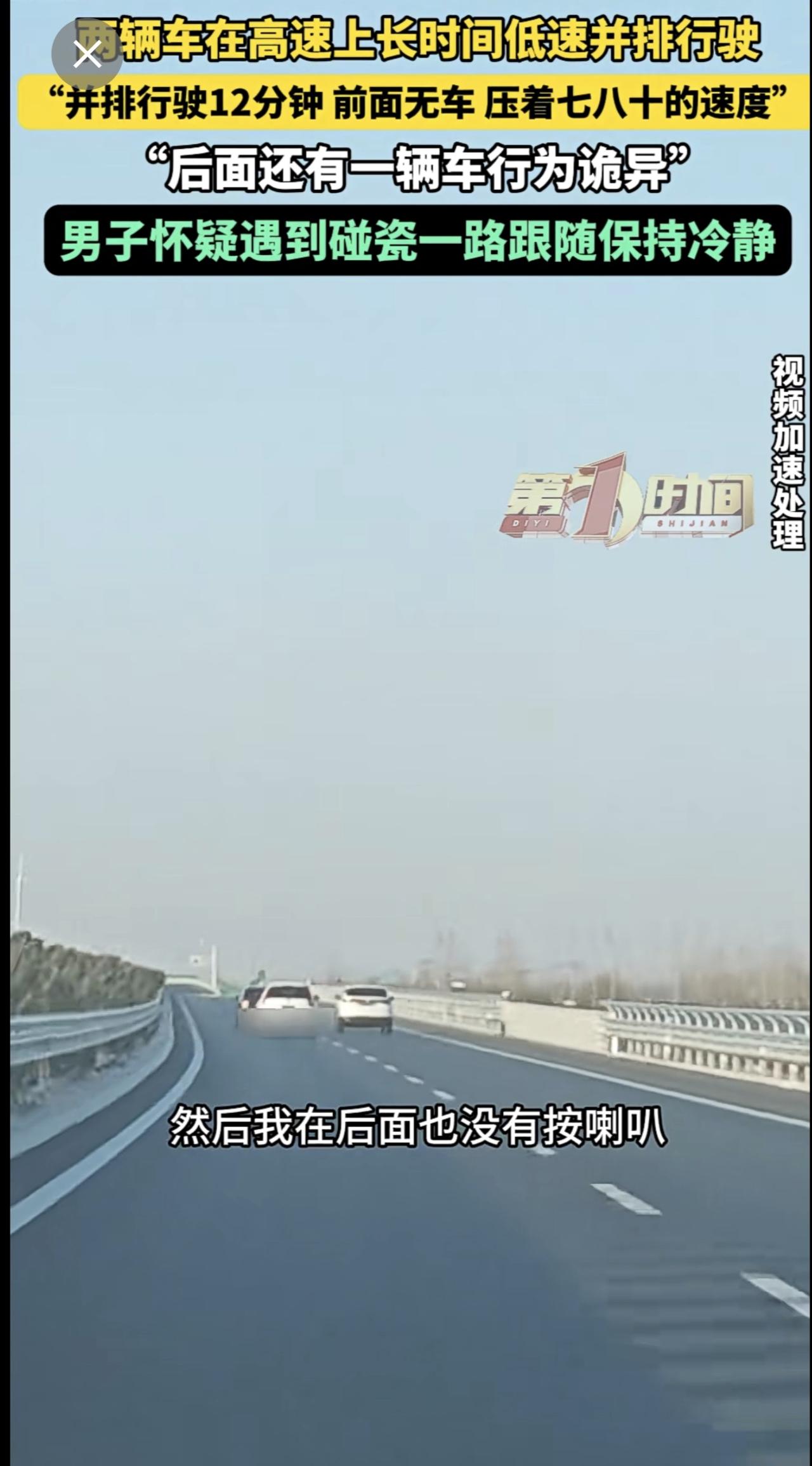 高速上两辆车长时间并排低速行驶,后车驾驶员怀疑对方想碰瓷。