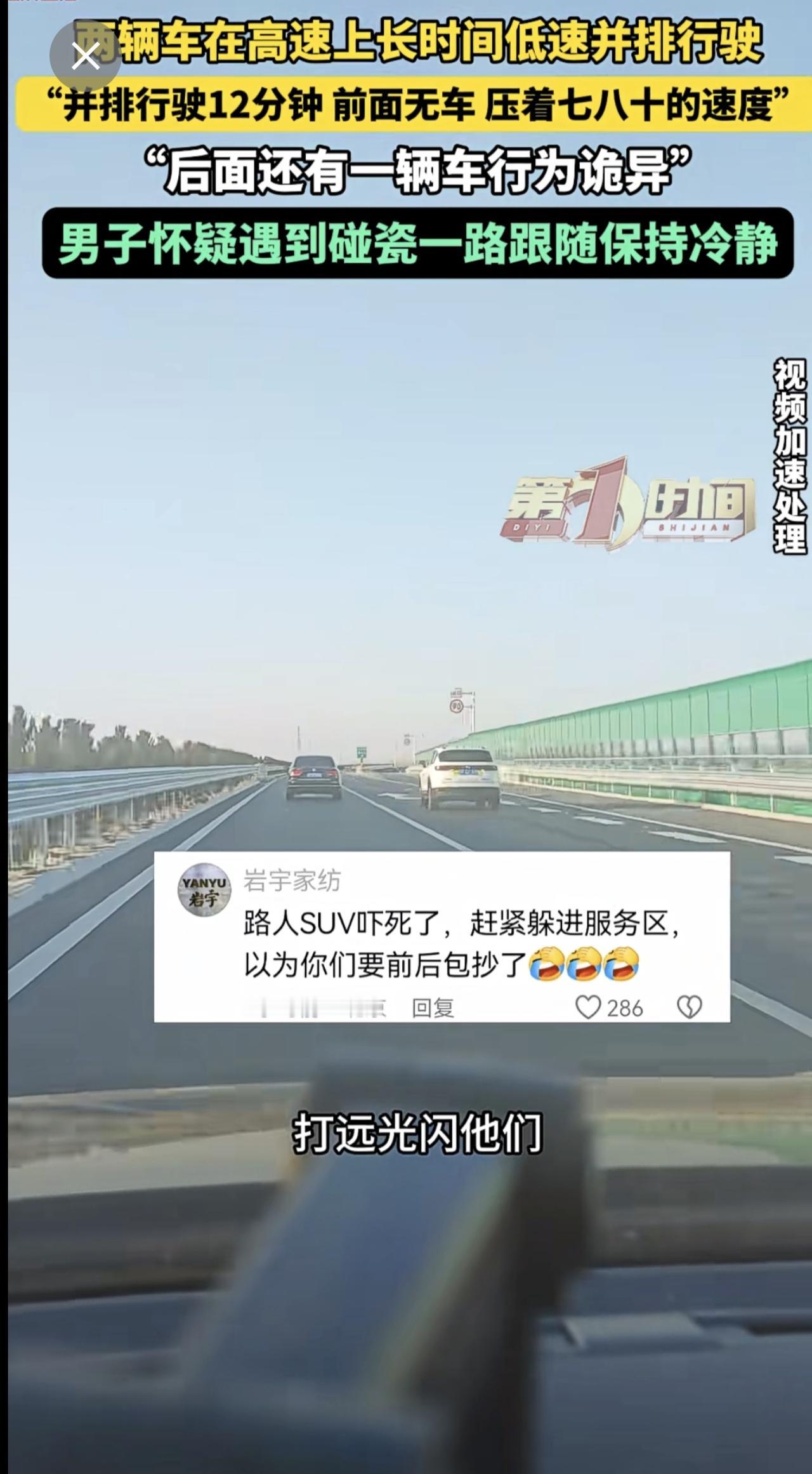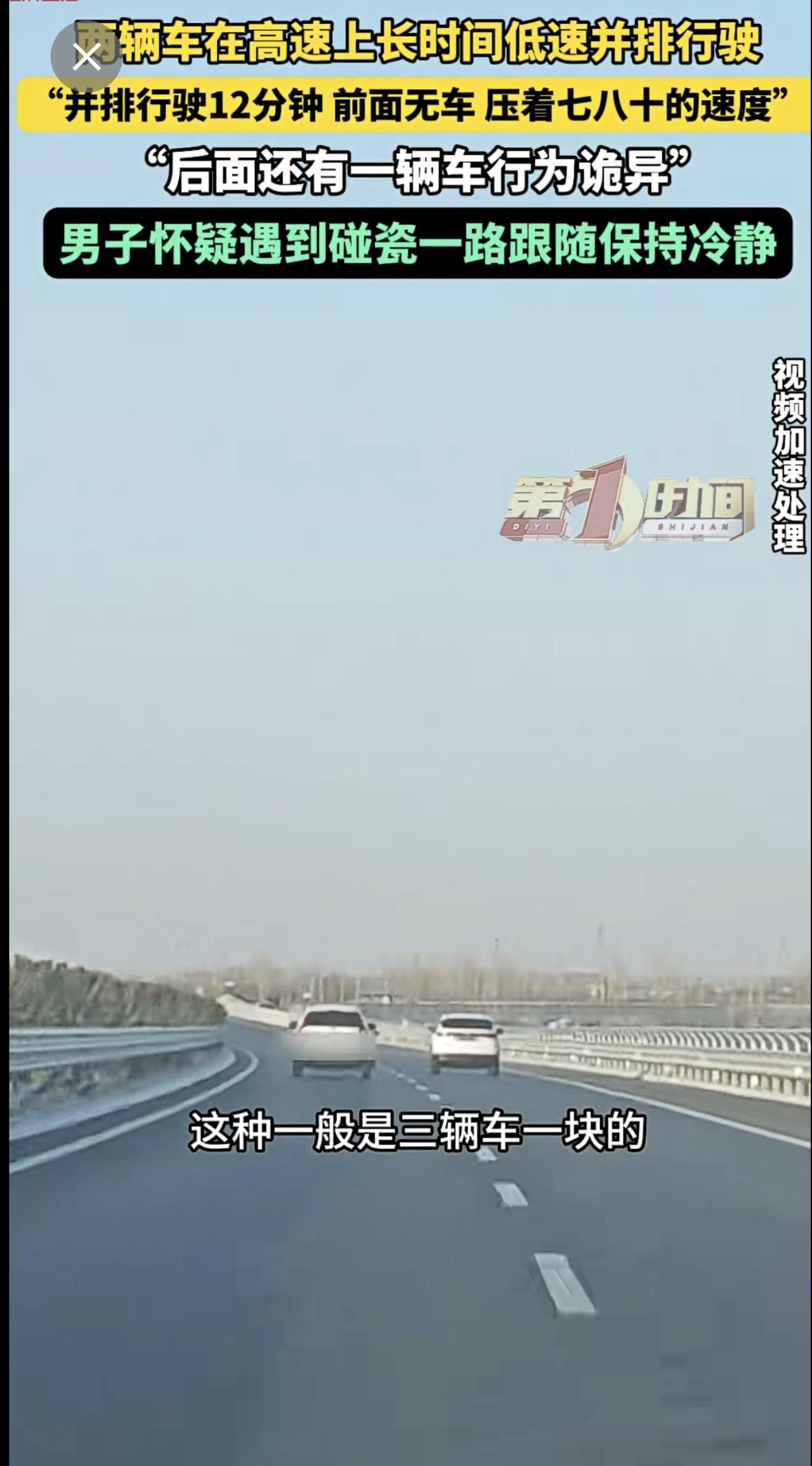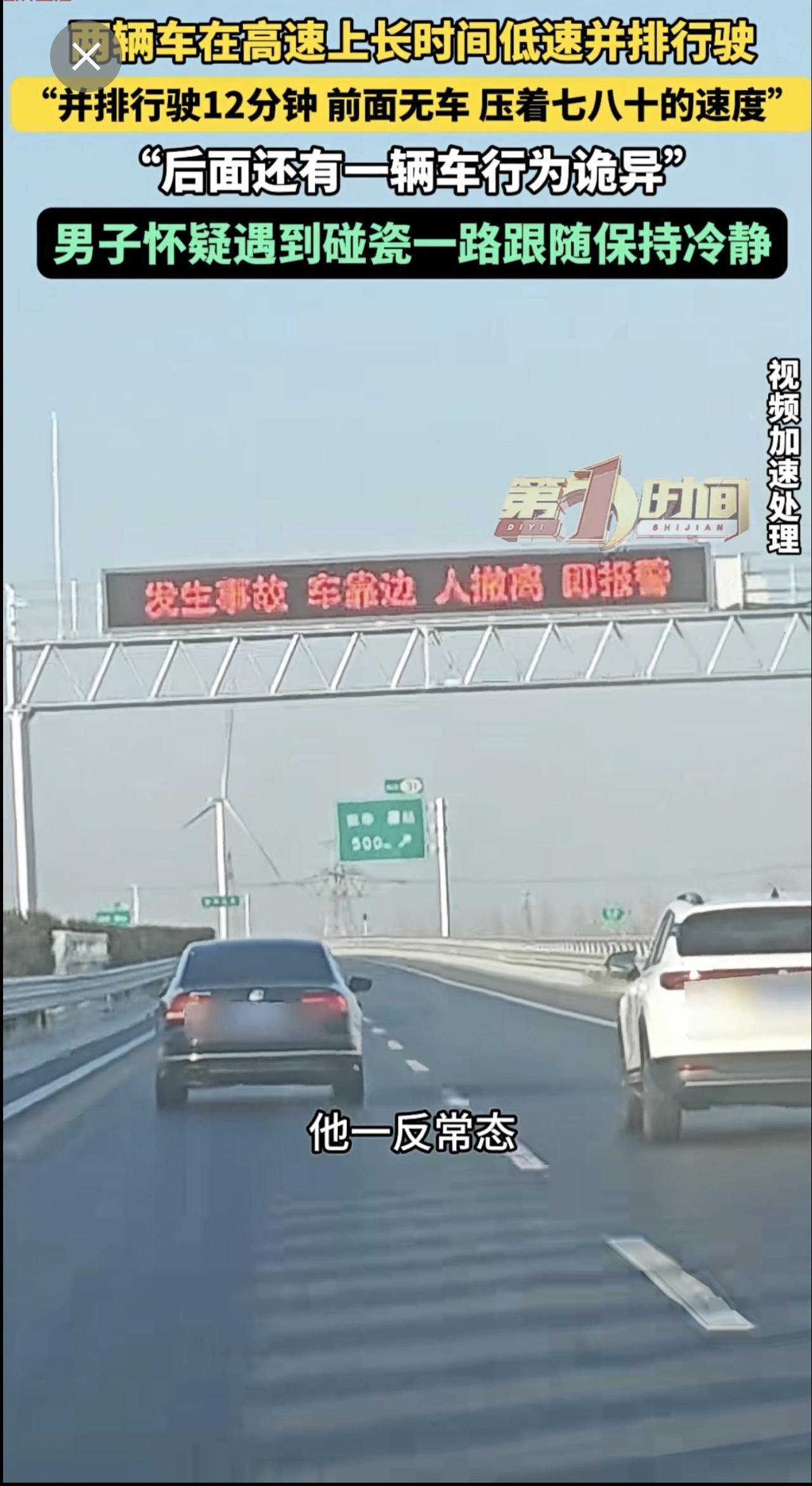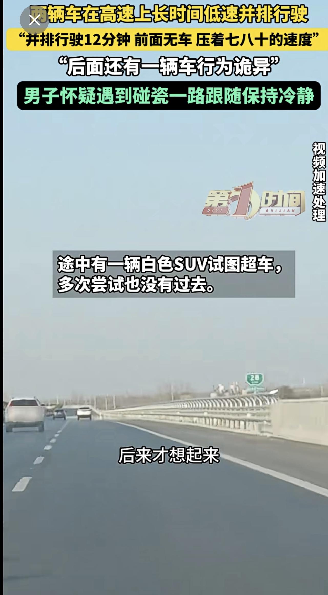 高速上两辆车长时间并排低速行驶,后车驾驶员怀疑对方想碰瓷。