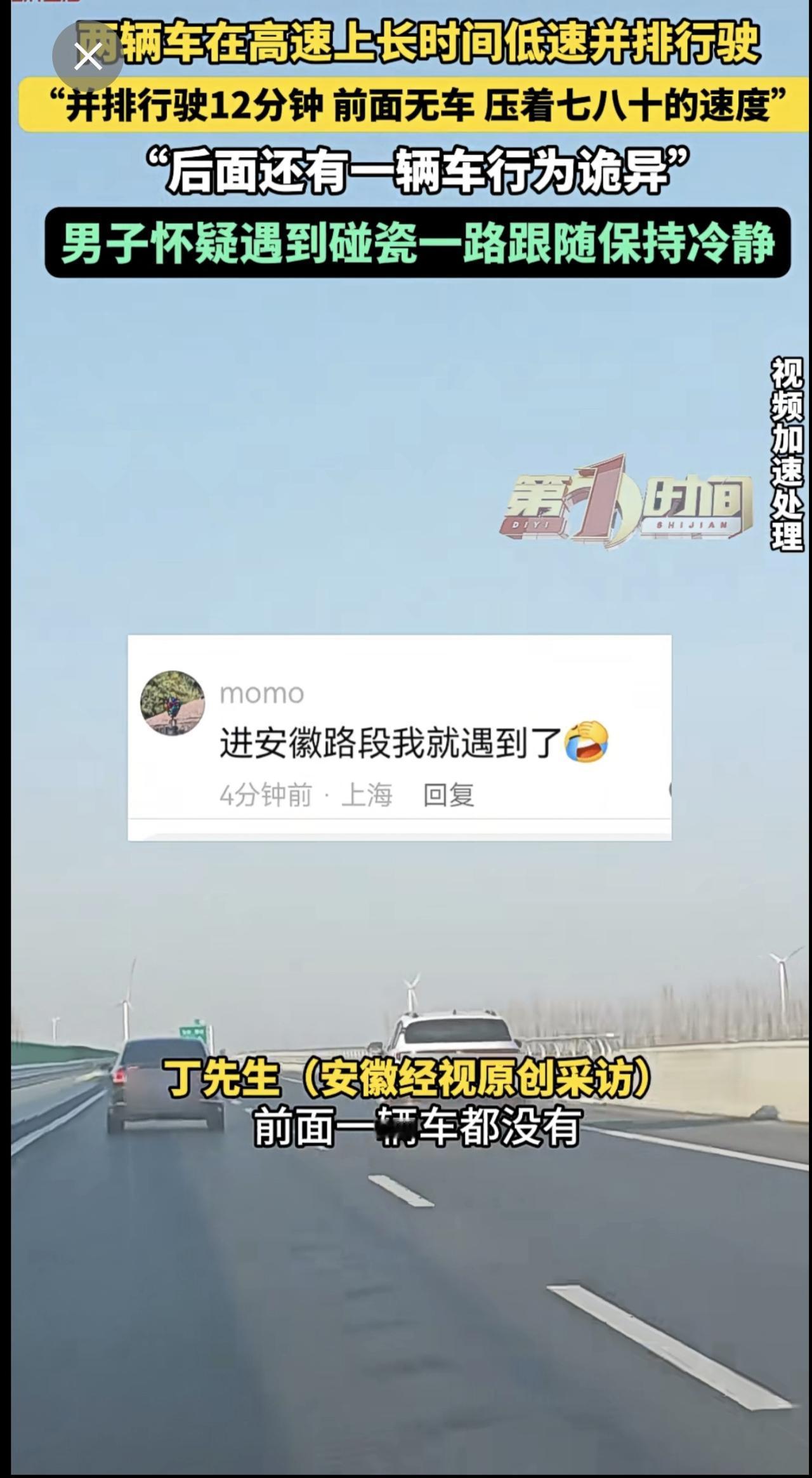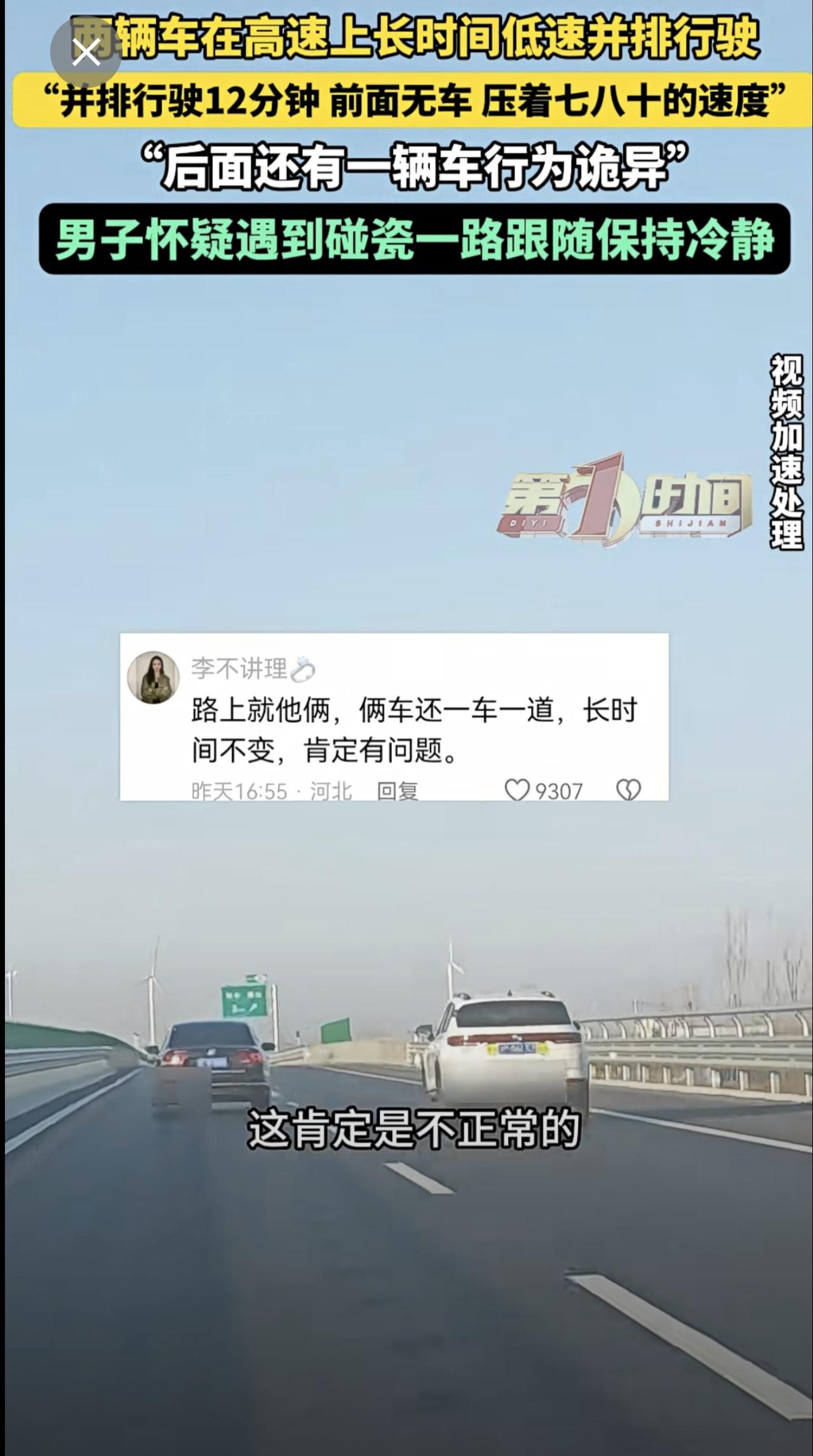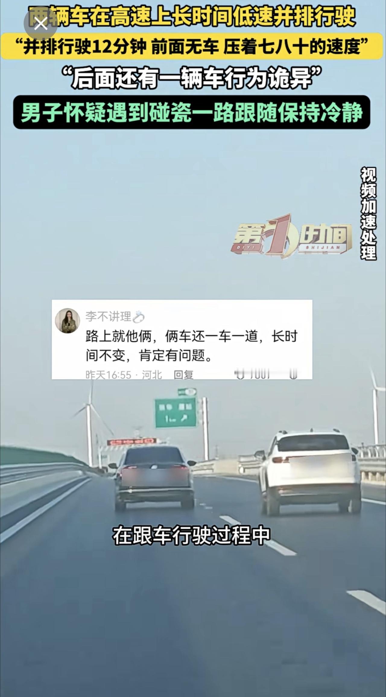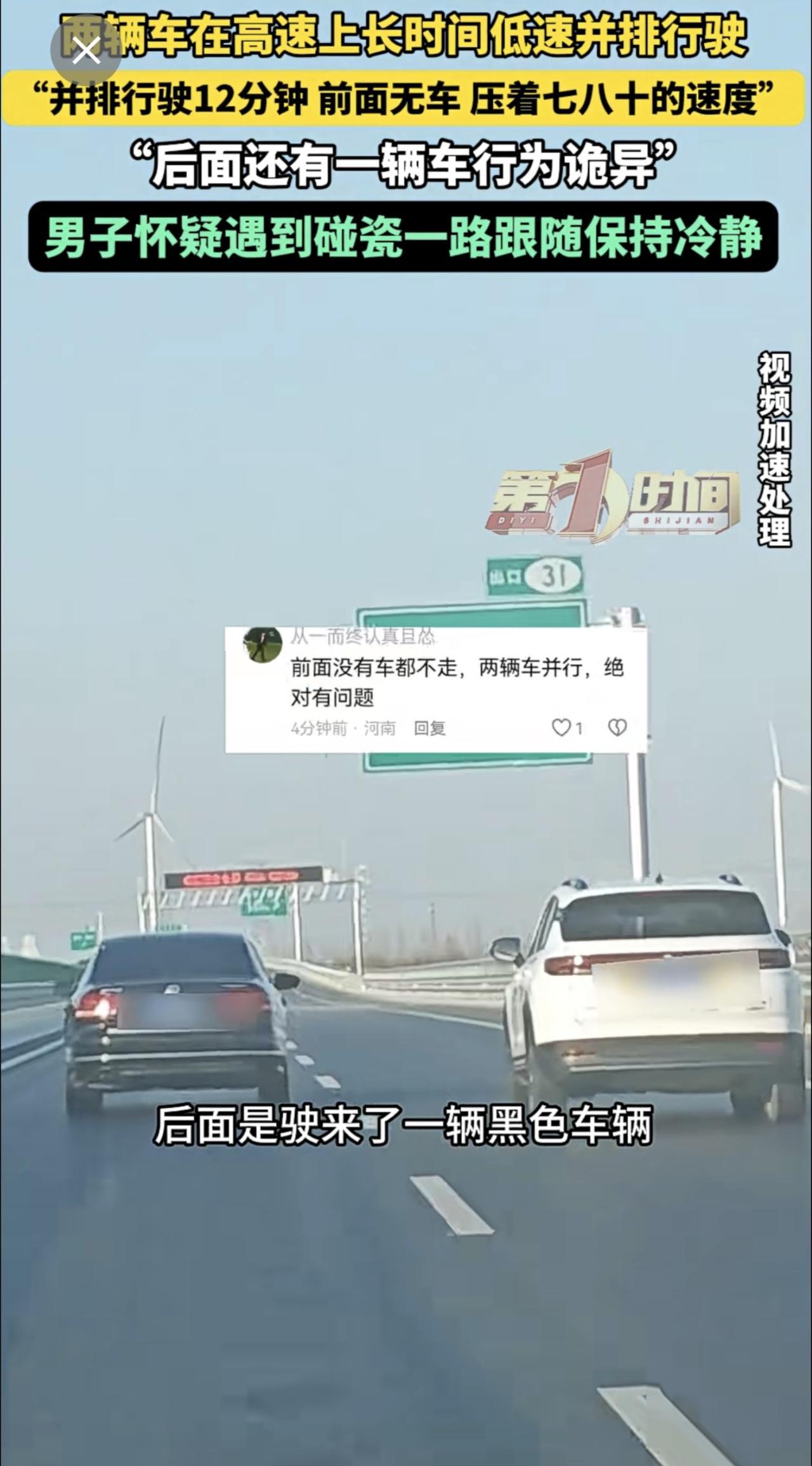 高速上两辆车长时间并排低速行驶,后车驾驶员怀疑对方想碰瓷。