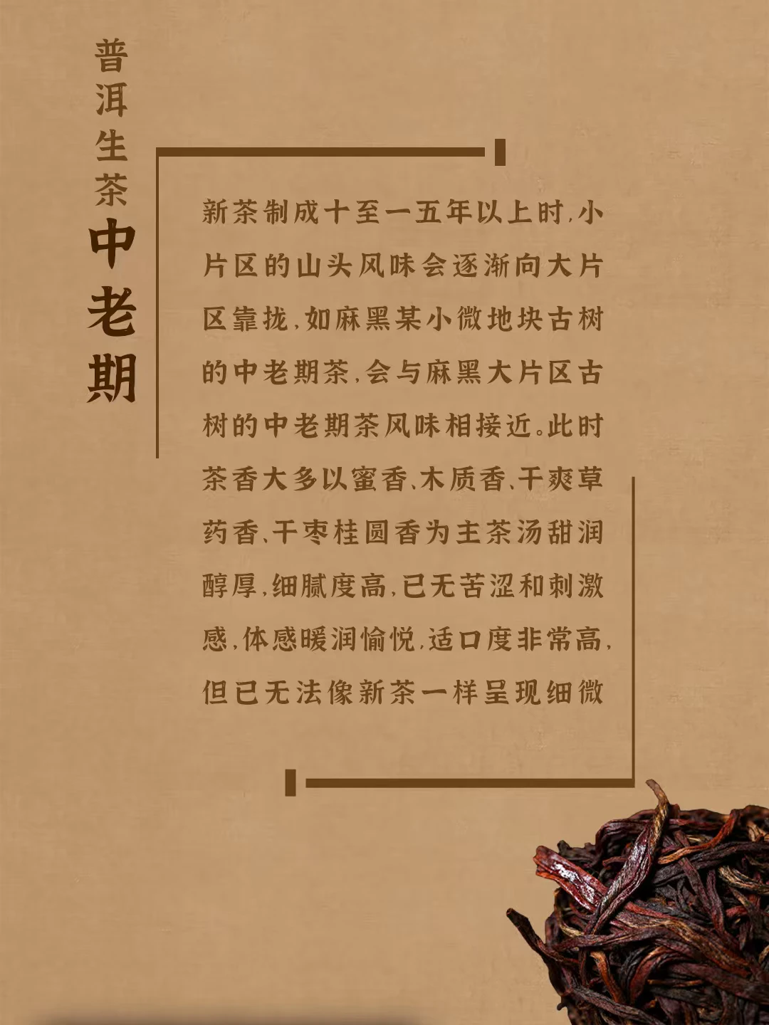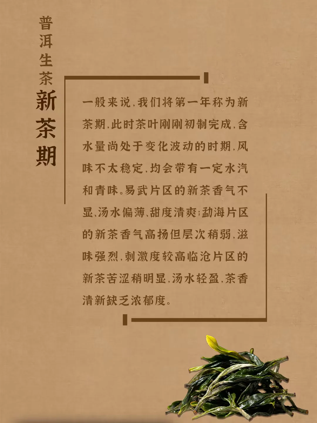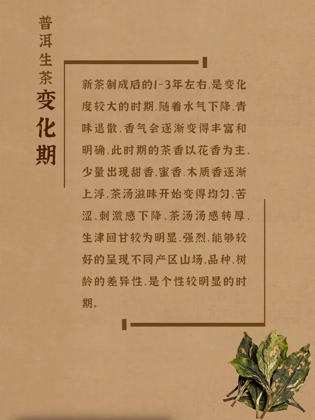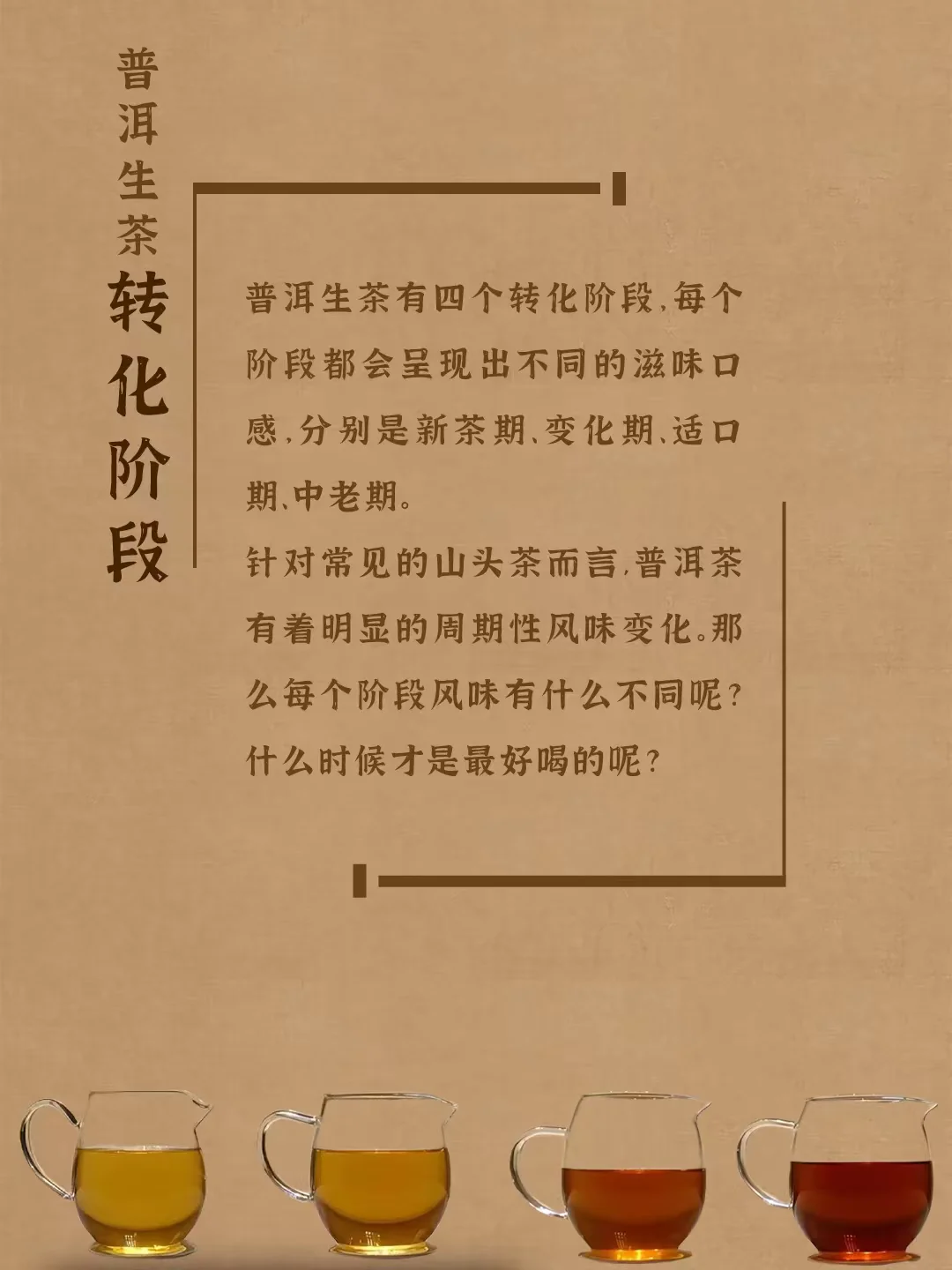 普洱生茶有四个转化阶段, 每个阶段都会呈现出不同的滋味口感, 分别是新茶期、变化期、适口期、中老期。 具体哪个阶段最好喝是因人而异的, 每个阶段都有其不同的风味特点, 但只要是好原料、好工艺、好仓储, 都是值得品鉴的。