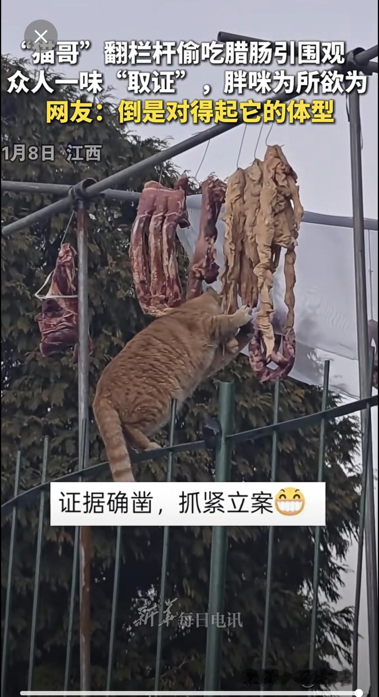 | “猫哥”翻栏杆偷吃腊肠引围观,众人一味“取证”,胖咪为所欲为!网友:倒是对得起它的体型