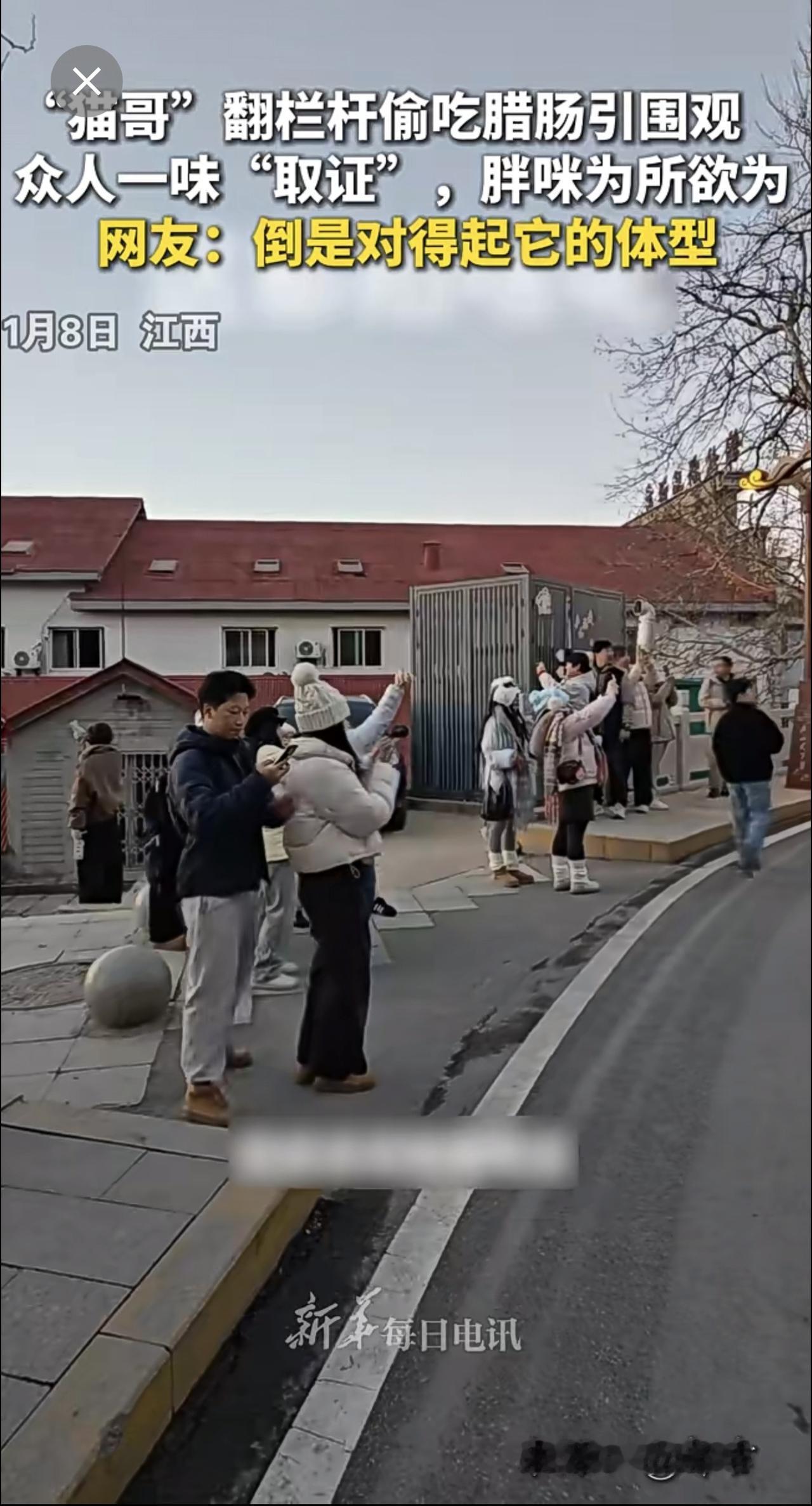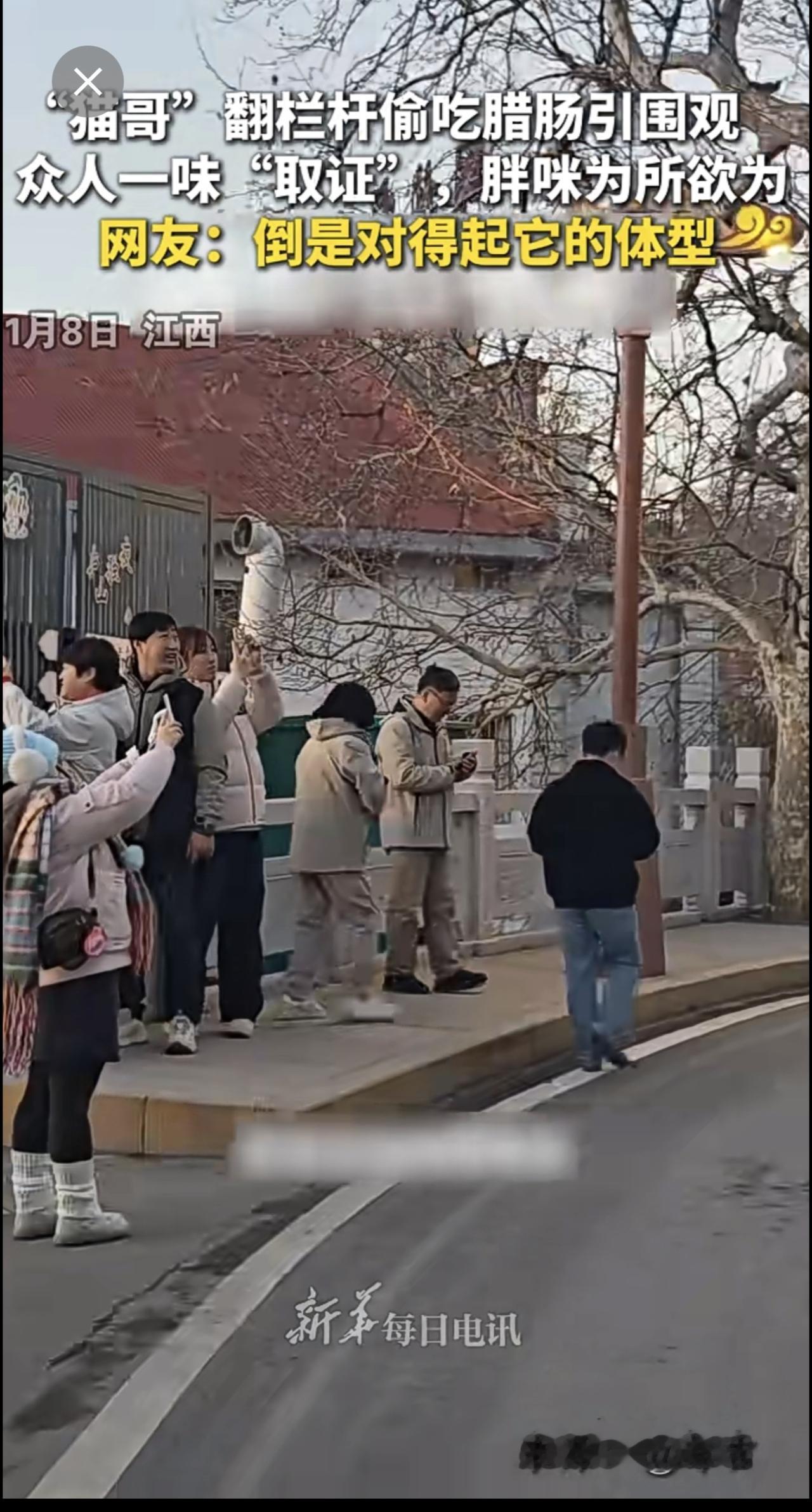 | “猫哥”翻栏杆偷吃腊肠引围观,众人一味“取证”,胖咪为所欲为!网友:倒是对得