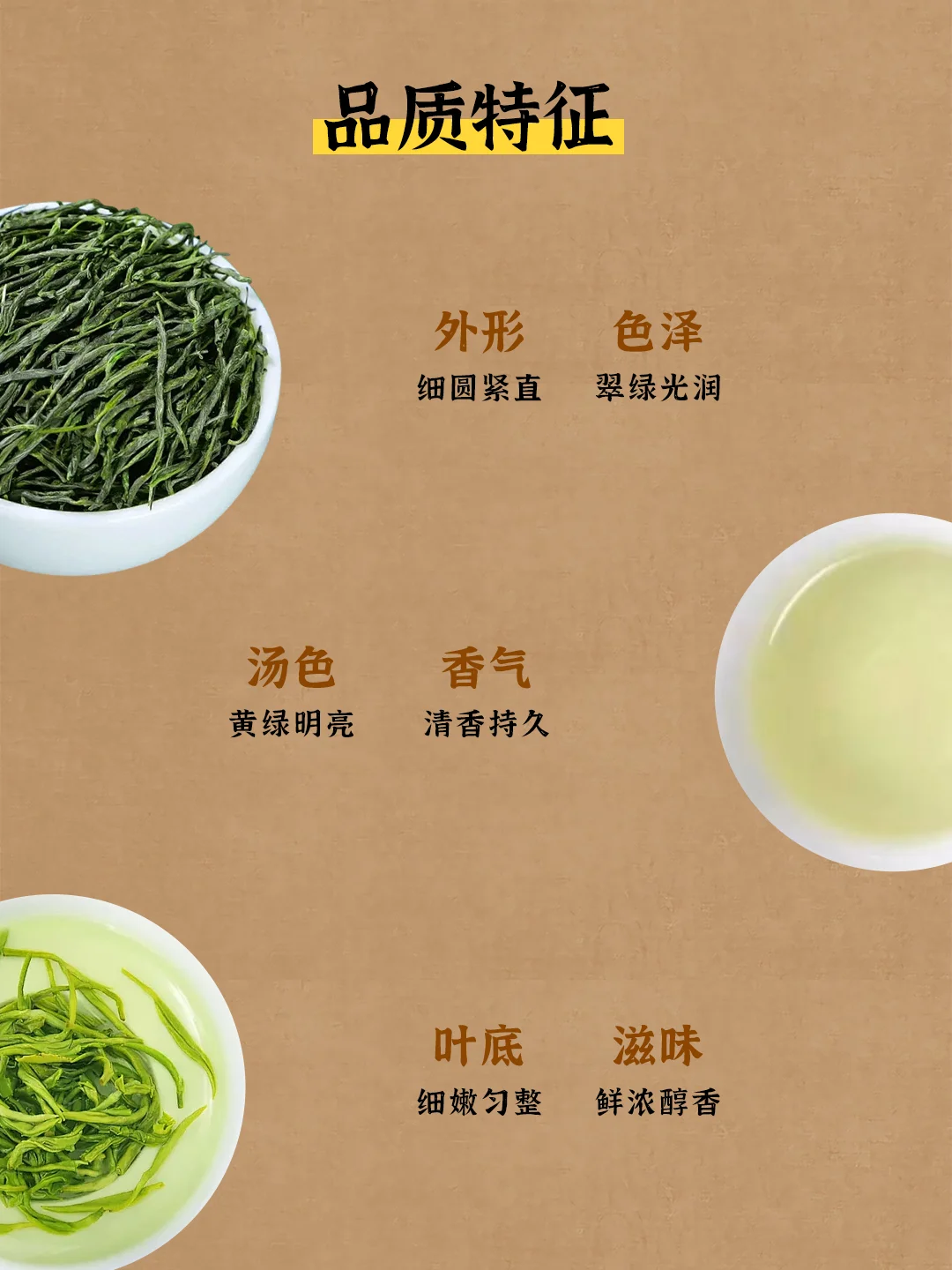 特点:细、圆、光、直,干茶如针,白毫密布,色泽翠绿带毫。