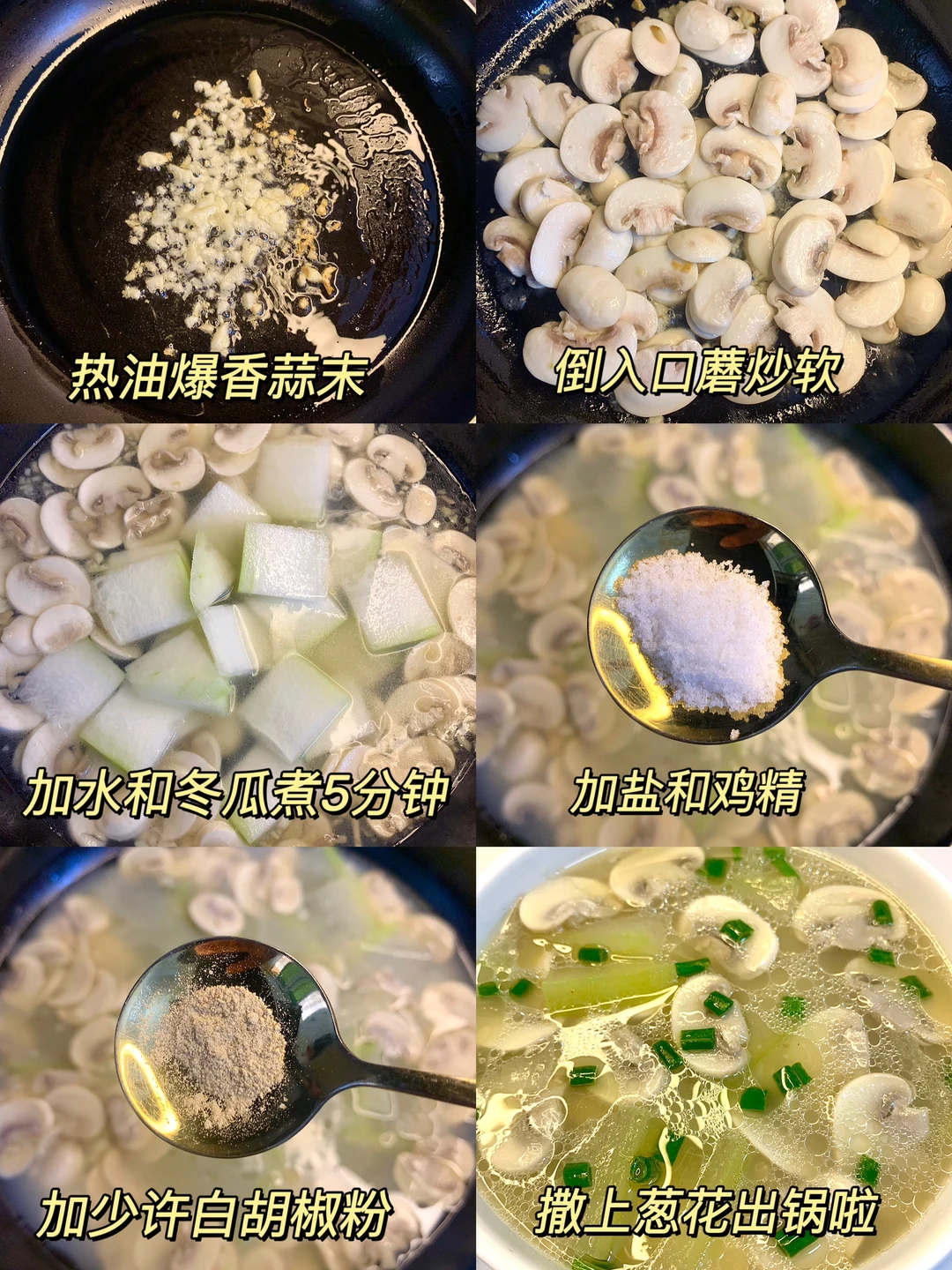 今天分享鲜掉眉毛的简单快手汤,✨冬瓜口蘑汤✨清爽低卡,口蘑鲜美,搭配东瓜软烂入味,汤汁鲜美浓郁,营养又好喝。做法也非常简单,厨房小白也能轻松搞定~ ☘️食材:冬瓜 口蘑 葱花 🥣做法:如图所示~