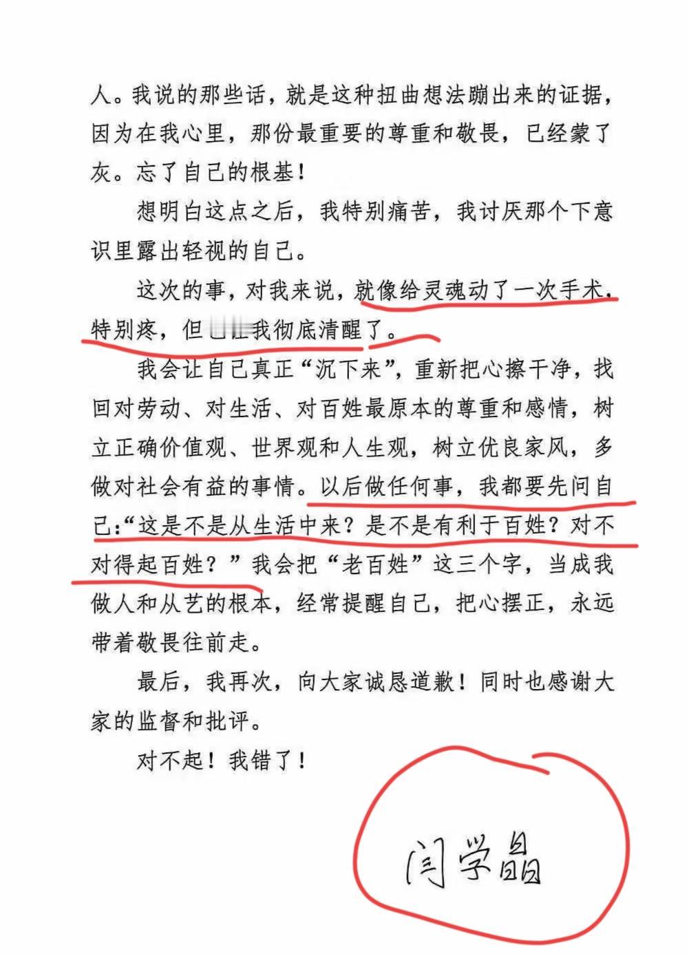 看了闫学晶那封迟来的道歉信, 我心里没起什么波澜, 反而觉得有点可笑……这哪是真心实意的悔过,分明是一场被逼到墙角后的止损。 如果只是网友骂两句,她或许根本不会放在心上,毕竟谁还没个“黑粉”呢?可这次不一样,板子真真切切地打在肉上了。 半个月前,她还在直播里皱着眉头算账,抱怨儿子儿媳挣得少,家里开销大。 那时候的她,或许觉得这只是婆妈间的闲聊,甚至是一种变相的“凡尔赛”炫耀。 面对铺天盖地的质疑,她的团队选择了最傲慢的方式——冷处理、删评论、甚至封号。那时候,她觉得只要不看,争议就会自己消失。 直到大年根底下,几记重锤把她砸醒了。 先是账号被封,这直接断了她和粉丝连接的命脉,也掐断了直播带货的财路;接着是佐香园解约,这不仅是面子挂不住,更是真金白银的巨额违约金损失;最后是儿子学历风波,把家庭的遮羞布都扯了下来。 这时候她才明白,这已经不是网友“酸”不“酸”的问题了,而是她的“饭碗”和“家底”都快保不住了。 所以,这封道歉信里写的“思想偏差”、“忘了本”,听着更像是一种求生欲。她终于慌了,因为当特权消失、光环褪去,那个曾经从黑土地里走出来的“山杏”,发现自己再也回不去了,只能硬着头皮在朋友圈发泄一番委屈。 有时候我在想,如果这次没有封号,没有解约,没有儿子学历被扒,她会道歉吗? 恐怕不会。她可能会继续在直播间里,用那种“坚持到底不能怂”的口吻,跟我们讲“能咋地”。 这一声迟来的“对不起”,到底是悔过,还是仅仅为了保住那点摇摇欲坠的商业价值? 大家觉得,这封道歉信,她写得走心吗?