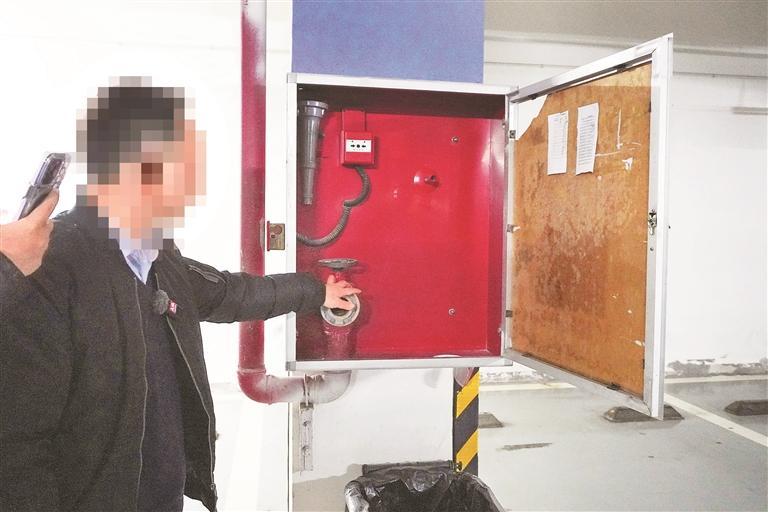 这里有几处消防栓箱,俞先生随机打开三个,其中一个消防栓出水口被石灰严实堵死,另外两个则缺失消防水带,消防设备沦为摆设。
