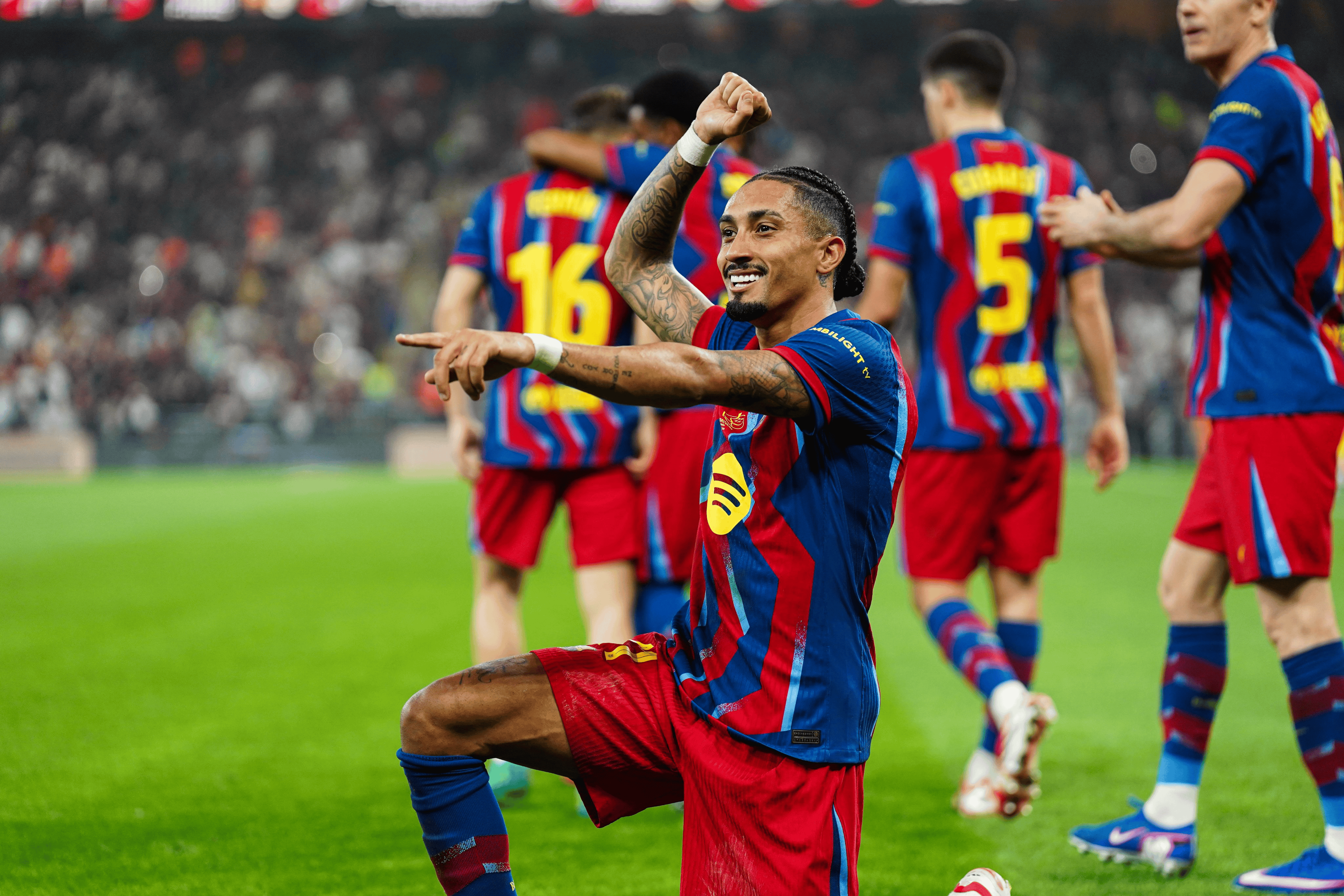 虎扑01月12日讯西班牙超级杯决赛,巴塞罗那3-2击败皇家马德里,拉菲尼亚在比赛中梅开二度。