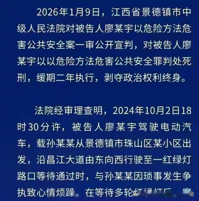 景德镇惨案一审宣判,情绪驾驶再响警钟 2026年1月9日,景德镇“一家三口被撞身亡案”一审宣判,被告人廖某宇因以危险方法危害公共安全罪被判死缓。2024年国庆夜,廖某宇因与女友争吵情绪失控,在限速40公里/小时路段飙车至129公里/小时,撞上过马路的一家三口,致三人死亡。 法院认定,廖某宇在市区主干道严重超速,危害公共安全,但看到被害人后采取了避让措施,属间接故意,且有自首情节,故判处死缓。受害家庭失去儿子、儿媳和不满一岁的孙子,家属患重度抑郁,拒绝对方80万元“私了”提议。 此案引发对情绪驾驶危害的广泛关注。专家指出,在城市道路极端超速等同于危害公共安全。判决体现了 “少杀、慎杀” 死刑政策,但受害家属表示将申请抗诉。案件警示:方向盘上的情绪可能成为致命凶器,公共安全需要每个驾驶者的理性守护。景德镇车祸 景德镇撞人事件 景德镇惨剧 景德镇家庭悲剧 景德镇家庭惨剧 景德镇惨案 景德镇事故 景德镇血案 景德镇撞人案件 景德镇肇事案 景德镇肇事父子 景德镇肇事 景德镇交通肇事 景德镇被撞案 景德镇肇事者 景德镇撞人案