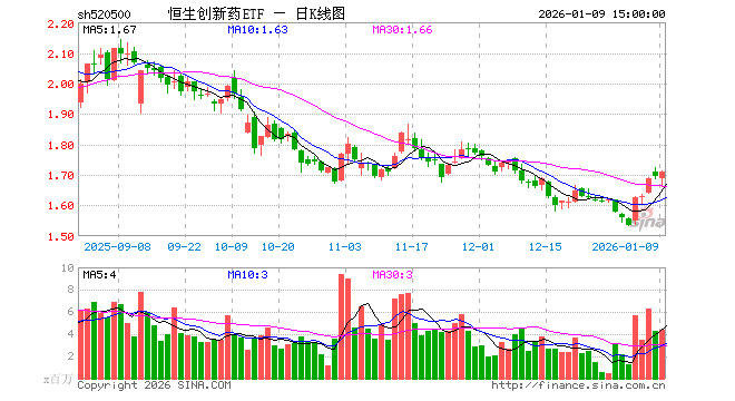 1月9日,恒生创新药ETF(520500)涨0.88%,成交额7.42亿元。当日份额减少1300.00万份,最新份额为12.34亿份,近20个交易日份额增加2500.00万份。最新资产净值计算值为21.18亿元。